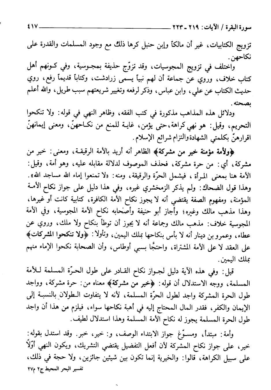 وَلَأَمَةٌ مُؤْمِنَةٌ خَيْرٌ مِنْ مُشْرِكَةٍ الظَّاهِرُ أَنَّهُ أُرِيدَ بِالْأَمَةِ الرَّقِيقَةَ، وَمَعْنَى: خَيْرٌ مِنْ مُشْرِكَةٍ، أَيْ: مِنْ حُرَّةٍ مُشْرِكَةٍ، فَحَذَفَ الْمَوْصُوفَ لِدَلَالَةِ مُقَابِلِهِ عَلَيْهِ، وَهُوَ أَمَةٌ، وَقِيلَ: