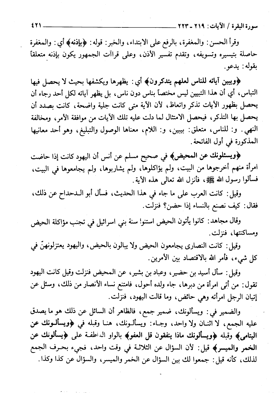 وَالضَّمِيرُ فِي: وَيَسْأَلُونَكَ، ضَمِيرُ جَمْعٍ، فَالظَّاهِرُ أَنَّ السَّائِلَ عَنْ ذَلِكَ هُوَ مَا يَصْدُقُ عَلَيْهِ الْجَمْعُ، لَا اثْنَانِ وَلَا وَاحِدٌ، وَجَاءَ: وَيَسْأَلُونَكَ، هُنَا وقبله في وَيَسْئَلُونَكَ عَنِ الْيَتامى وقبله وَيَسْئَلُونَكَ مَاذَا يُنْفِقُونَ قُلِ الْعَفْوَ بالواو العاطفة على يَسْئَلُونَكَ عَنِ الْخَمْرِ وَالْمَيْسِرِ قِيلَ: لِأَنَّ السُّؤَالَ عَنِ الثَّلَاثَةِ فِي وَقْتٍ وَاحِدٍ، فَجِيءَ بِحَرْفِ الْجَمْعِ لِذَلِكَ، كَأَنَّهُ قِيلَ: جَمَعُوا لَكَ بَيْنَ السؤال عن الخمر والميسر، وَالسُّؤَالِ عَنْ كَذَا وَكَذَا.