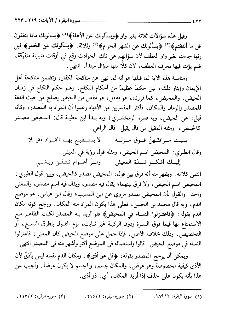وَمُنَاسَبَةُ هَذِهِ الْآيَةِ لِمَا قَبْلَهَا هُوَ أَنَّهُ لَمَّا نَهَى عَنْ مُنَاكَحَةِ الْكُفَّارِ، وَتَضَمَّنَ مُنَاكَحَةَ أَهْلِ الْإِيمَانِ وَإِيثَارَ ذَلِكَ، بَيَّنَ حُكْمًا عَظِيمًا مِنْ أَحْكَامِ النِّكَاحِ، وَهُوَ حُكْمُ النِّكَاحِ فِي زَمَانِ الْحَيْضِ. وَالْمَحِيضُ، كَمَا قَرَّرْنَاهُ، هُوَ مَفْعَلٌ، هُوَ مَفْعَلٌ مِنَ الْحَيْضِ يَصْلُحُ مِنْ حَيْثُ اللُّغَةِ لِلْمَصْدَرِ وَالزَّمَانِ وَالْمَكَانِ، فَأَكْثَرُ الْمُفَسِّرِينَ مِنَ الْأُدَبَاءِ زَعَمُوا أَنَّ الْمُرَادَ بِهِ الْمَصْدَرُ، وَكَأَنَّهُ قِيلَ: عَنِ الْحَيْضِ، وَبِهِ فَسَّرَهُ الزَّمَخْشَرِيُّ وَبِهِ بَدَأَ ابْنُ عَطِيَّةَ قَالَ: الْمَحِيضُ مَصْدَرٌ كَالْحَيْضِ، وَمِثْلُهُ الْمَقِيلُ مِنْ قَالَ يَقِيلُ. قَالَ الرَّاعِي: