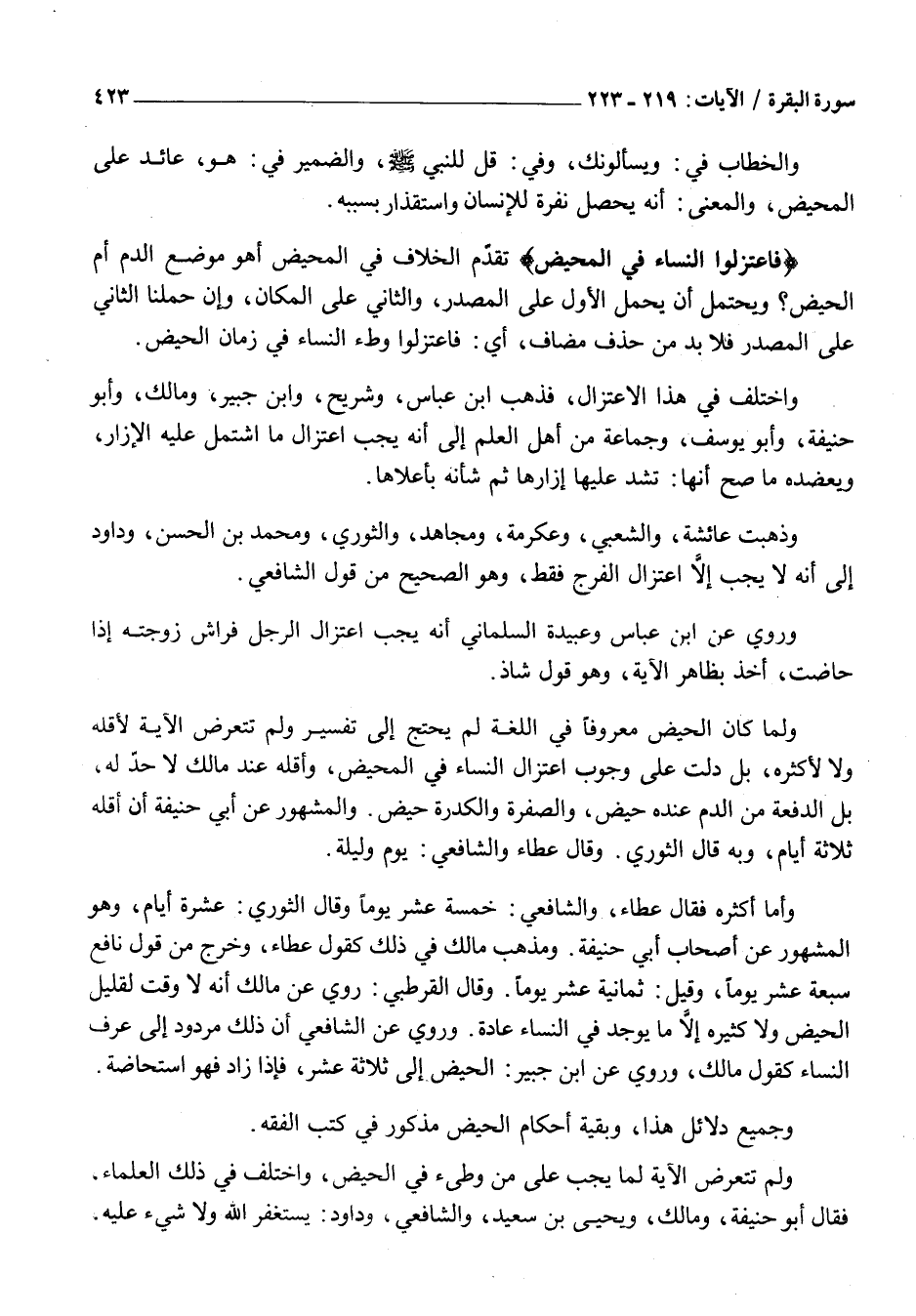 فَاعْتَزِلُوا النِّساءَ فِي الْمَحِيضِ تَقَدَّمَ الْخِلَافُ فِي الْمَحِيضِ أَهُوَ مَوْضِعُ الدَّمِ أَمِ الْحَيْضُ؟ وَيُحْتَمَلُ أَنْ يُحْمَلَ الْأَوَّلُ عَلَى الْمَصْدَرِ، وَالثَّانِي عَلَى الْمَكَانِ، وَإِنْ حَمَلْنَا الثَّانِيَ عَلَى الْمَصْدَرِ فَلَا بُدَّ مِنْ حَذْفِ مُضَافٍ، أَيْ: فَاعْتَزِلُوا وَطْءَ النِّسَاءِ فِي زَمَانِ الْحَيْضِ.