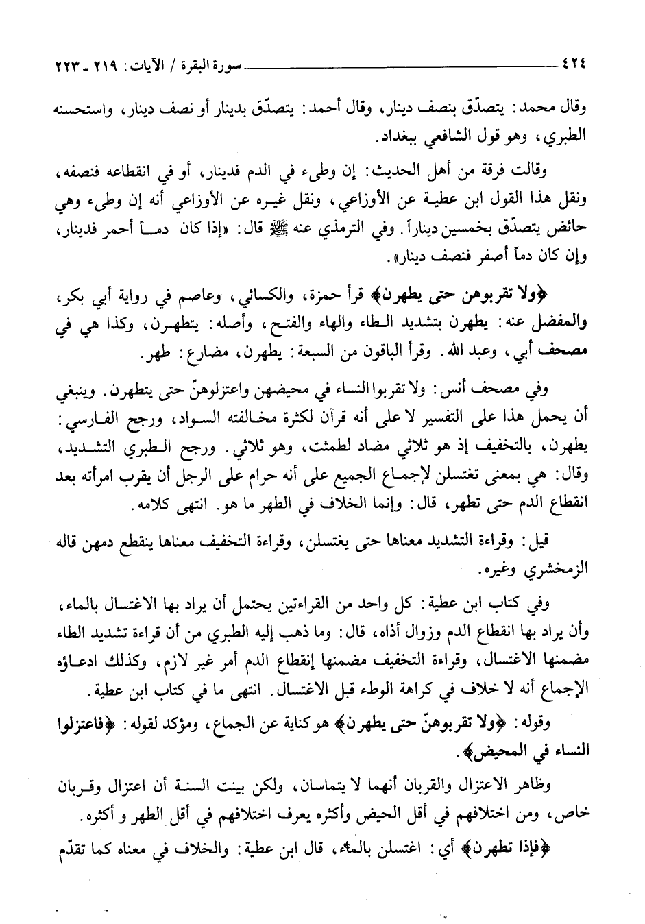 وَفِي كِتَابِ ابْنِ عَطِيَّةَ: كُلُّ وَاحِدٍ مِنَ الْقِرَاءَتَيْنِ يُحْتَمَلُ أَنْ يُرَادَ بِهَا الِاغْتِسَالُ بِالْمَاءِ، وَأَنْ يُرَادَ بِهَا انْقِطَاعُ الدَّمِ وَزَوَالُ أَذَاهُ، قَالَ: وَمَا ذَهَبَ إِلَيْهِ الطَّبَرِيُّ مِنْ أَنَّ قِرَاءَةَ تَشْدِيدِ الطَّاءِ مُضَمَّنُهَا الِاغْتِسَالُ، وَقِرَاءَةَ التَّخْفِيفِ مُضَمَّنُهَا انْقِطَاعُ الدَّمِ أَمْرٌ غَيْرُ لَازِمٍ، وَكَذَلِكَ ادِّعَاؤُهُ الْإِجْمَاعَ أَنَّهُ لَا خِلَافَ فِي كَرَاهَةِ الْوَطْءِ قَبْلَ الِاغْتِسَالِ. انْتَهَى مَا فِي كِتَابِ ابْنِ عَطِيَّةَ.