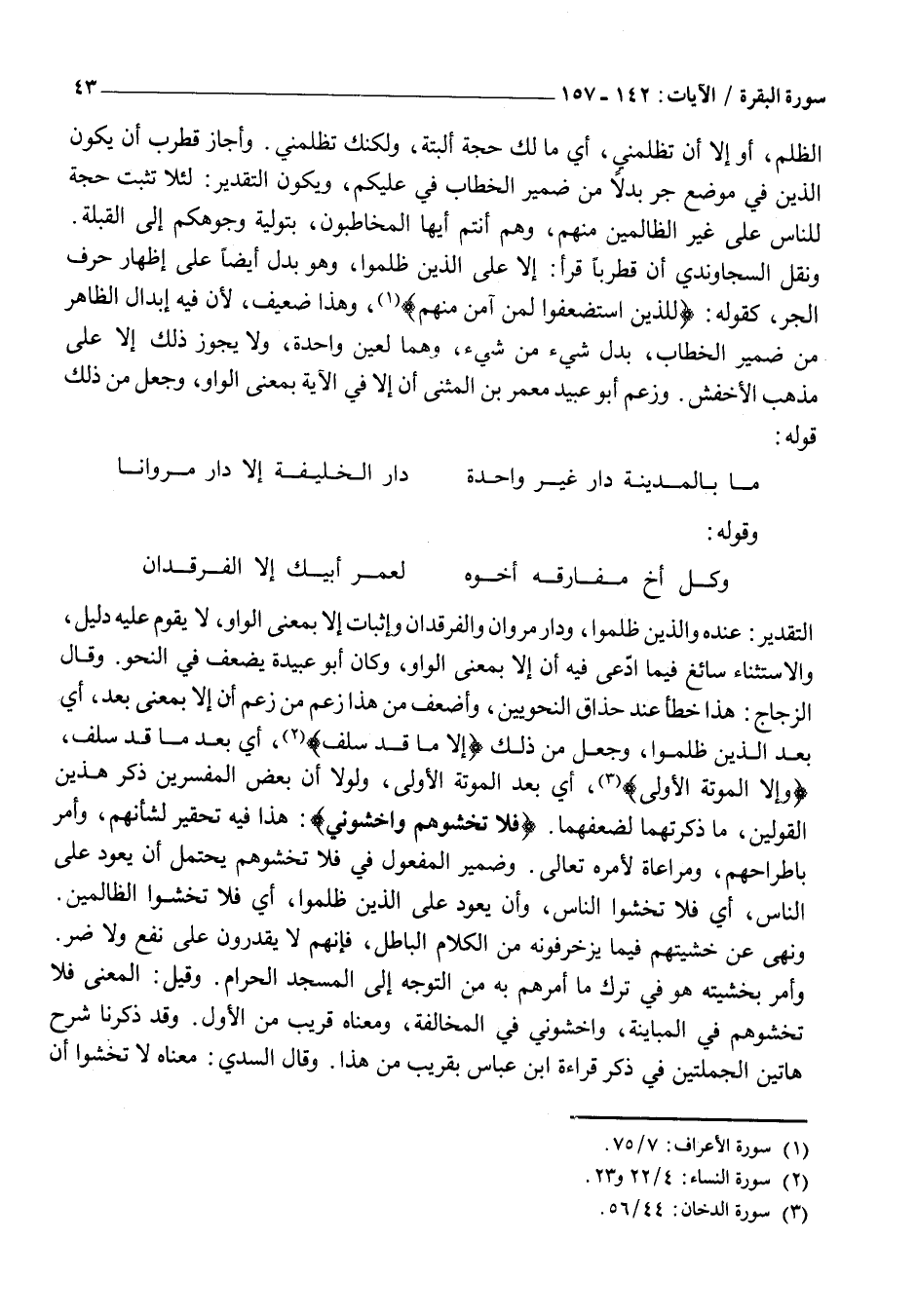 الظُّلْمَ، أَوْ إِلَّا أَنْ تَظْلِمَنِي، أَيْ مَا لَكَ حُجَّةٌ أَلْبَتَّةَ، وَلَكِنَّكَ تَظْلِمُنِي. وَأَجَازَ قُطْرُبٌ أَنْ يَكُونَ الَّذِينَ فِي مَوْضِعِ جَرٍّ بَدَلًا مِنْ ضَمِيرِ الْخِطَابِ فِي عَلَيْكُمْ، وَيَكُونُ التَّقْدِيرُ: لِئَلَّا تَثْبُتَ حُجَّةٌ لِلنَّاسِ عَلَى غَيْرِ الظَّالِمِينَ مِنْهُمْ، وَهُمْ أَنْتُمْ أَيُّهَا الْمُخَاطَبُونَ، بِتَوْلِيَةِ وُجُوهِكُمْ إِلَى الْقِبْلَةِ.