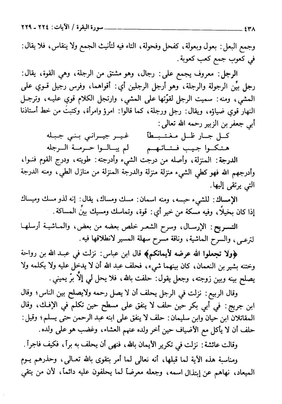 وَلا تَجْعَلُوا اللَّهَ عُرْضَةً لِأَيْمانِكُمْ قَالَ ابْنُ عَبَّاسٍ: نَزَلَتْ فِي عَبْدِ اللَّهِ بْنِ رَوَاحَةَ وَخَتَنِهِ بَشِيرِ بْنِ النُّعْمَانِ، كَانَ بَيْنَهُمَا شَيْءٌ، فَحَلَفَ عَبْدُ اللَّهِ أَنْ لَا يَدْخُلَ عَلَيْهِ وَلَا يُكَلِّمَهُ وَلَا يُصْلِحَ بَيْنَهُ وَبَيْنَ زَوْجَتِهِ، وَجَعَلَ يَقُولُ: حَلَفْتُ بِاللَّهِ، فَلَا يَحِلُّ لِي إِلَّا بِرُّ يَمِينِي.