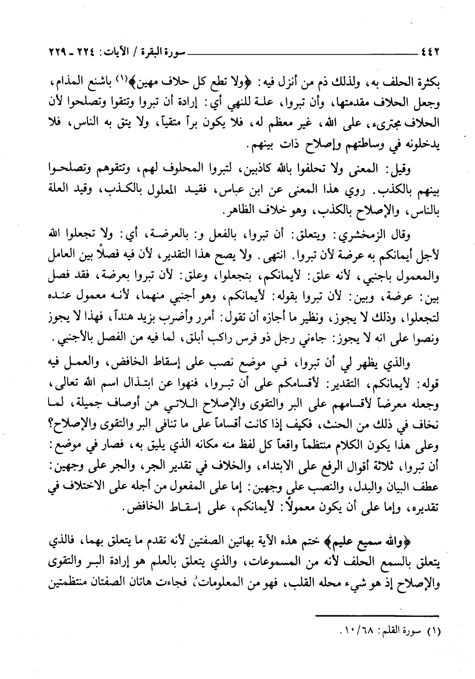وَاللَّهُ سَمِيعٌ عَلِيمٌ خَتَمَ هَذِهِ الْآيَةَ بِهَاتَيْنِ الصِّفَتَيْنِ لِأَنَّهُ تَقَدَّمَ مَا يَتَعَلَّقُ بِهِمَا، فَالَّذِي يَتَعَلَّقُ بِالسَّمْعِ الْحَلِفُ لِأَنَّهُ مِنَ الْمَسْمُوعَاتِ، وَالَّذِي يَتَعَلَّقُ بِالْعِلْمِ هُوَ إِرَادَةُ الْبِرِّ وَالتَّقْوَى وَالْإِصْلَاحِ إِذْ هُوَ شَيْءٌ مَحَلُّهُ الْقَلْبُ، فَهُوَ مِنَ الْمَعْلُومَاتِ، فَجَاءَتْ هاتان الصفتان منتظمتين