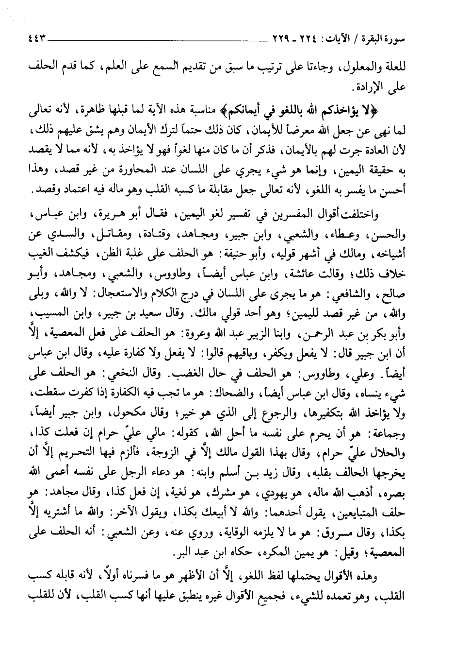 وَهَذِهِ الْأَقْوَالُ يَحْتَمِلُهَا لَفْظُ اللَّغْوِ، إِلَّا أَنَّ الْأَظْهَرَ هُوَ مَا فَسَّرْنَاهُ أَوَّلًا، لِأَنَّهُ قَابَلَهُ كَسْبُ الْقَلْبِ، وَهُوَ تَعَمُّدُهُ لِلشَّيْءِ، فَجَمِيعُ الْأَقْوَالِ غَيْرُهُ يَنْطَبِقُ عَلَيْهَا أَنَّهَا كَسْبُ الْقَلْبِ، لِأَنَّ لِلْقَلْبِ