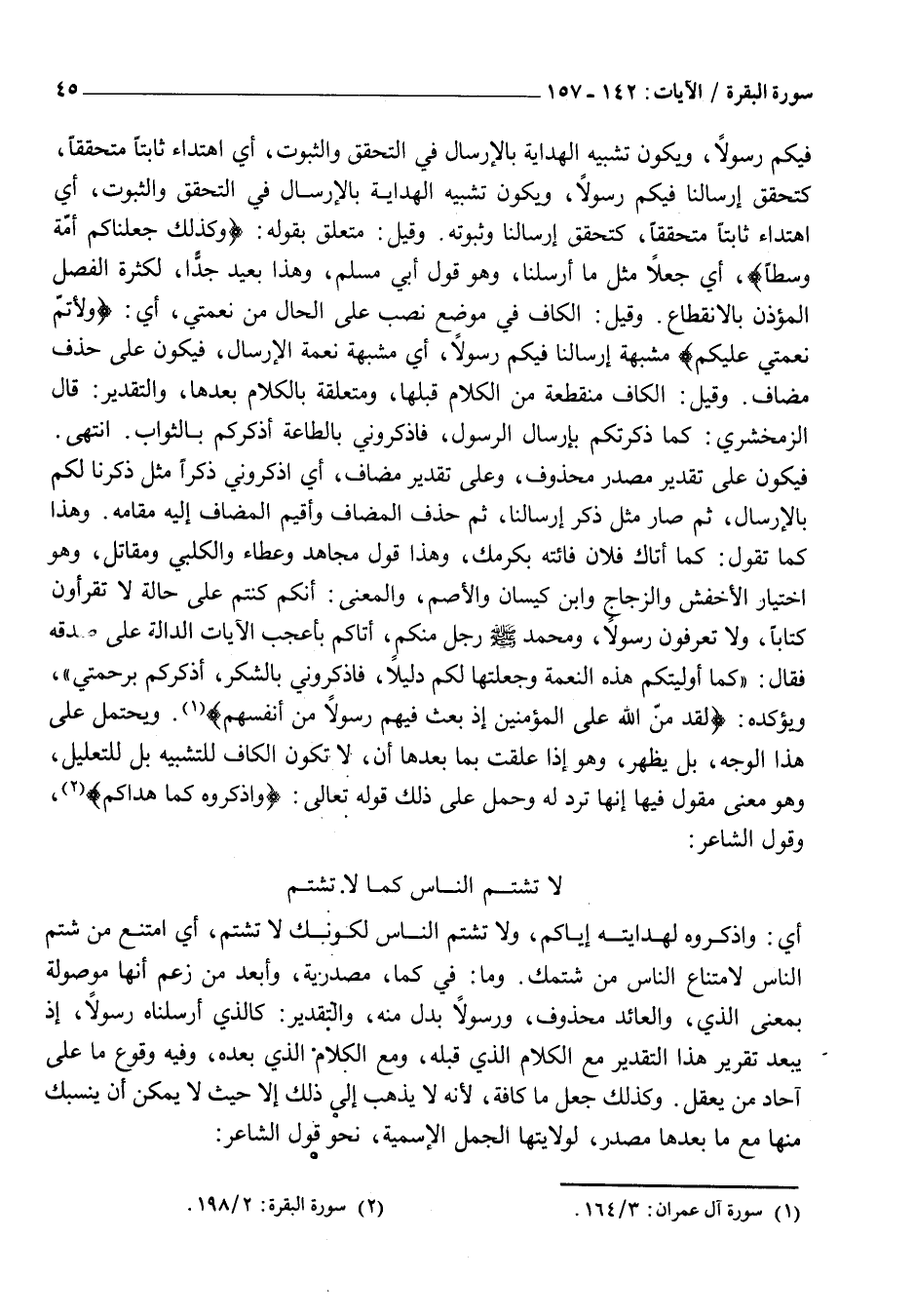 فِيكُمْ رَسُولًا، وَيَكُونُ تَشْبِيهُ الْهِدَايَةِ بِالْإِرْسَالِ فِي التَّحَقُّقِ وَالثُّبُوتِ، أَيِ اهْتِدَاءً ثَابِتًا متحققا، كتحقق إِرْسَالِنَا فِيكُمْ رَسُولًا، وَيَكُونُ تَشْبِيهُ الْهِدَايَةِ بِالْإِرْسَالِ فِي التَّحَقُّقِ وَالثُّبُوتِ، أَيِ اهْتِدَاءً ثَابِتًا مُتَحَقِّقًا، كَتَحَقُّقِ إِرْسَالِنَا وَثُبُوتِهِ. وَقِيلَ: مُتَعَلِّقٌ بِقَوْلِهِ: وَكَذلِكَ جَعَلْناكُمْ أُمَّةً وَسَطاً، أَيْ جَعْلًا مِثْلَ مَا أَرْسَلْنَا، وَهُوَ قَوْلُ أَبِي مُسْلِمٍ، وَهَذَا بَعِيدٌ جِدًّا، لِكَثْرَةِ الْفَصْلِ الْمُؤْذِنِ بِالِانْقِطَاعِ. وَقِيلَ: الْكَافُ فِي مَوْضِعِ نَصْبٍ عَلَى الْحَالِ مِنَ نِعْمَتِي، أَيْ: وَلِأُتِمَّ نِعْمَتِي عَلَيْكُمْ مُشَبِّهَةً إِرْسَالَنَا فِيكُمْ رَسُولًا، أَيْ مُشَبِّهَةً نِعْمَةَ الْإِرْسَالِ، فَيَكُونُ عَلَى حَذْفِ مُضَافٍ. وَقِيلَ: الْكَافُ مُنْقَطِعَةٌ مِنَ الْكَلَامِ قَبْلَهَا، وَمُتَعَلِّقَةٌ بِالْكَلَامِ بَعْدَهَا، وَالتَّقْدِيرُ: قَالَ الزَّمَخْشَرِيُّ: كَمَا ذَكَرْتُكُمْ بِإِرْسَالِ الرَّسُولِ، فَاذْكُرُونِي بِالطَّاعَةِ أَذْكُرْكُمْ بِالثَّوَابِ. انْتَهَى.