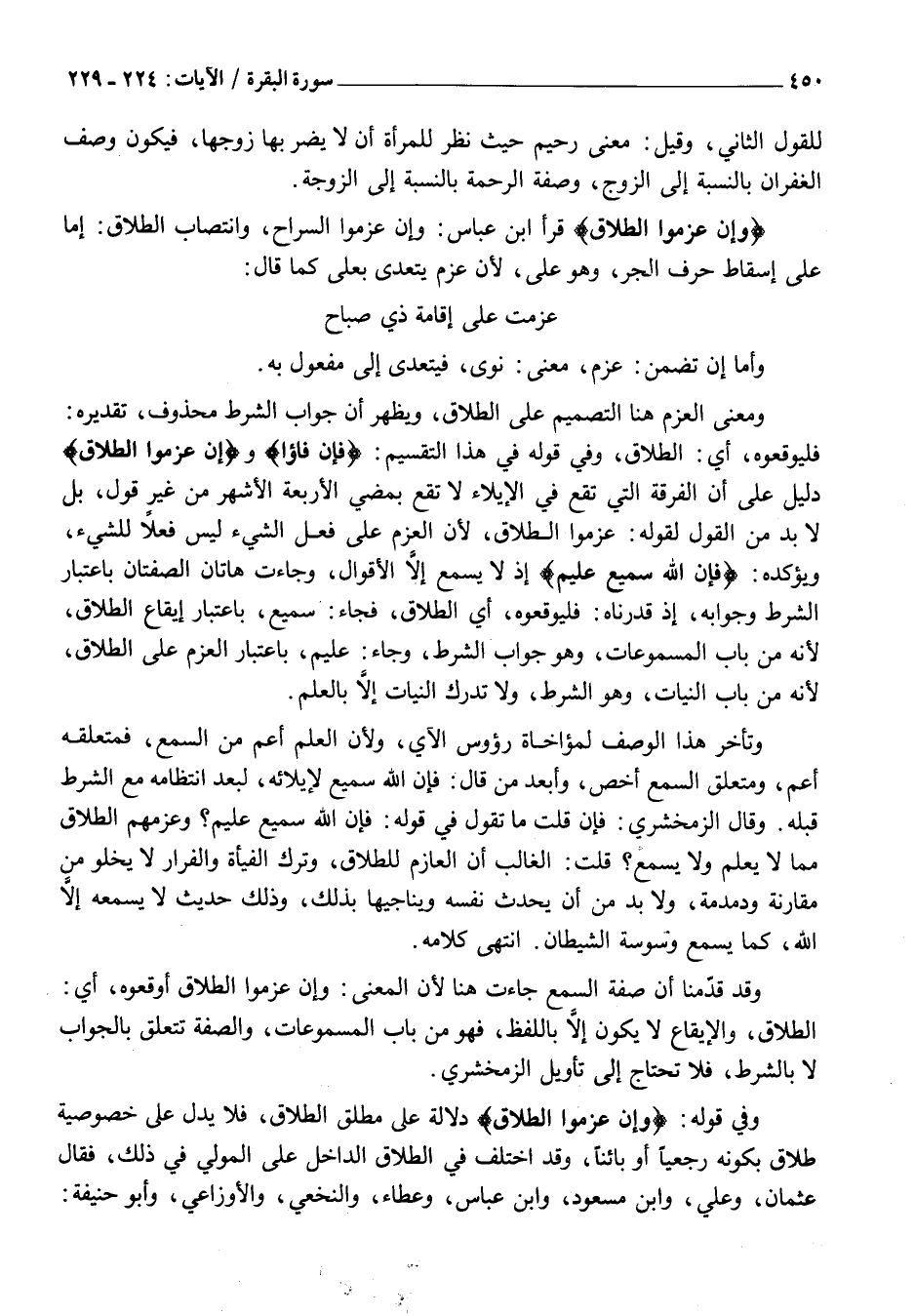 فَلْيُوقِعُوهُ، أَيِ: الطَّلَاقَ، وَفِي قَوْلِهِ فِي هَذَا التَّقْسِيمِ: فَإِنْ فاؤُ وإِنْ عَزَمُوا الطَّلاقَ دَلِيلٌ عَلَى أَنَّ الْفُرْقَةَ الَّتِي تَقَعُ فِي الْإِيلَاءِ لَا تَقَعُ بِمُضِيِّ الْأَرْبَعَةِ الْأَشْهُرِ مِنْ غَيْرِ قَوْلٍ، بَلْ لَا بُدَّ مِنَ الْقَوْلِ لِقَوْلِهِ: عَزَمُوا الطَّلَاقَ، لِأَنَّ الْعَزْمَ عَلَى فِعْلِ الشَّيْءِ لَيْسَ فِعْلًا لِلشَّيْءِ، وَيُؤَكِّدُهُ: فَإِنَّ اللَّهَ سَمِيعٌ عَلِيمٌ إِذْ لَا يُسْمَعُ إِلَّا الْأَقْوَالُ، وَجَاءَتْ هَاتَانِ الصِّفَتَانِ بِاعْتِبَارِ الشَّرْطِ وَجَوَابِهِ، إِذْ قَدَّرْنَاهُ: فَلْيُوقِعُوهُ، أَيِ الطَّلَاقَ، فَجَاءَ: سَمِيعٌ، بِاعْتِبَارِ إِيقَاعِ الطَّلَاقِ، لِأَنَّهُ مِنْ بَابِ الْمَسْمُوعَاتِ، وَهُوَ جَوَابُ الشَّرْطِ، وَجَاءَ: عَلِيمٌ، بِاعْتِبَارِ الْعَزْمِ عَلَى الطَّلَاقِ، لِأَنَّهُ مِنْ بَابِ النِّيَّاتِ، وَهُوَ الشَّرْطُ، وَلَا تُدْرَكُ النِّيَّاتُ إِلَّا بِالْعِلْمِ.
