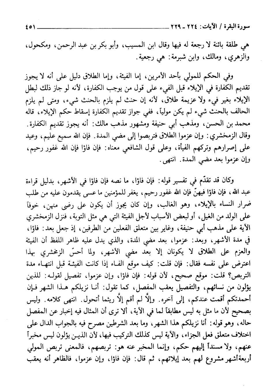 وَكَانَ قَدْ تَقَدَّمَ فِي تَفْسِيرِ قَوْلِهِ: فإن فاؤا، ما نصه فإن فاؤا فِي الْأَشْهُرِ، بِدَلِيلِ قِرَاءَةِ عَبْدِ اللَّهِ، فإن فاؤا فِيهِنَّ فَإِنَّ اللَّهَ غَفُورٌ رَحِيمٌ، يَغْفِرُ لِلْمُؤْمِنِينَ مَا عَسَى يُقْدِمُونَ عَلَيْهِ مِنْ طَلَبِ ضِرَارِ النِّسَاءِ بِالْإِيلَاءِ، وَهُوَ الْغَالِبُ، وَإِنْ كَانَ يَجُوزُ أَنْ يَكُونَ عَلَى رِضًى مِنْهُنَّ، خَوْفًا عَلَى الْوَلَدِ مِنَ الْغَيْلِ، أَوْ لِبَعْضِ الْأَسْبَابِ لِأَجْلِ الْفَيْئَةِ الَّتِي هِيَ مِثْلُ التَّوْبَةِ، فَنَزَّلَ الزَّمَخْشَرِيُّ الْآيَةَ عَلَى مَذْهَبِ أَبِي حَنِيفَةَ، وَغَايَرَ بَيْنَ مُتَعَلِّقِ الْفِعْلَيْنِ مِنَ الطَّرَفَيْنِ، إِذْ جَعَلَ بَعْدَ: فاؤا، فِي مُدَّةِ الْأَشْهُرِ، وَبَعْدَ: عَزَمُوا، بَعْدَ مُضِيِّ الْمُدَّةِ، وَالَّذِي يَدُلُّ عَلَيْهِ ظَاهِرُ اللَّفْظِ أَنَّ الْفَيْئَةَ وَالْعَزْمَ عَلَى الطَّلَاقِ لَا يَكُونَانِ إِلَّا بَعْدَ مُضِيِّ الْأَشْهُرِ، وَلَمَّا أَحَسَّ الزَّمَخْشَرِيُّ بِهَذَا اعْتَرَضَ عَلَى نَفْسِهِ فَقَالَ: فَإِنْ قُلْتَ: كَيْفَ مَوْقِعُ الْفَاءِ إِذَا كَانَتِ الْفَيْئَةُ قَبْلَ انْتِهَاءِ مُدَّةِ التَّرَبُّصِ؟ قُلْتُ: مَوْقِعٌ صَحِيحٌ، لِأَنَّ قوله: فإن فاؤا، وإن عَزَمُوا، تَفْصِيلٌ لِقَوْلِهِ: لِلَّذِينَ يُؤْلُونَ مِنْ نِسَائِهِمْ، وَالتَّفْصِيلُ يَعْقُبُ الْمُفَصَّلَ، كَمَا تَقُولُ: أَنَا نَزِيلُكُمْ هَذَا الشَّهْرَ فَإِنْ أَحْمَدْتُكُمْ أَقَمْتُ عِنْدَكُمْ، إِلَى آخِرِهِ. وَإِلَّا لَمْ أَقُمْ إِلَّا رَيْثَمَا أَتَحَوَّلُ. انْتَهَى كَلَامُهُ. وَلَيْسَ بِصَحِيحٍ لِأَنَّ مَا مَثَّلَ بِهِ لَيْسَ مُطَابِقًا لِمَا فِي الْآيَةِ، أَلَا تَرَى أَنَّ الْمِثَالَ فِيهِ إِخْبَارٌ عَنِ الْمُفَصَّلِ حَالُهُ، وَهُوَ قَوْلُهُ: أَنَا نَزِيلُكُمْ هَذَا الشَّهْرَ، وَمَا بَعْدَ الشَّرْطَيْنِ مُصَرَّحٌ فِيهِ بِالْجَوَابِ الدَّالِّ عَلَى اخْتِلَافِ مُتَعَلِّقِ فِعْلِ الْجَزَاءِ، وَالْآيَةُ لَيْسَ كَذَلِكَ التَّرْكِيبُ فِيهَا، لِأَنَّ الَّذِينَ يُؤْلُونَ لَيْسَ مُخْبَرًا عَنْهُمْ، وَلَا مُسْنَدًا إِلَيْهِمْ حُكْمٌ، وَإِنَّمَا الْمُخْبَرُ عَنْهُ هُوَ: تَرَبُّصُهُمْ، فَالْمَعْنَى تَرَبُّصُ الْمُولِي أَرْبَعَةَ أَشْهُرٍ مَشْرُوعٌ لَهُمْ بَعْدَ إِيلَائِهِمْ، ثُمَّ قَالَ: فَإِنْ فاؤا، وَإِنْ عَزَمُوا، فَالظَّاهِرُ أَنَّهُ يَعْقُبُ