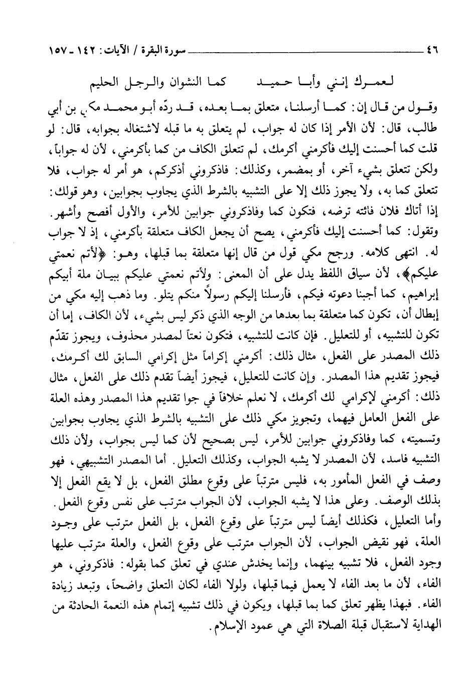 وَتَقُولُ: كَمَا أَحْسَنْتُ إِلَيْكَ فَأَكْرِمْنِي، يَصِحُّ أَنْ يَجْعَلَ الْكَافَ مُتَعَلِّقَةً بِأَكْرِمْنِي، إِذْ لَا جَوَابَ لَهُ. انْتَهَى كَلَامُهُ. وَرَجَّحَ مَكِّيٌّ قَوْلَ مَنْ قَالَ إِنَّهَا مُتَعَلِّقَةٌ بِمَا قَبْلَهَا، وهو: لِأُتِمَّ نِعْمَتِي عَلَيْكُمْ، لِأَنَّ سِيَاقَ اللَّفْظِ يَدُلُّ عَلَى أَنَّ الْمَعْنَى: وَلِأُتِمَّ نِعْمَتِي عَلَيْكُمْ بِبَيَانِ مِلَّةِ أَبِيكُمْ إِبْرَاهِيمَ، كَمَا أَجَبْنَا دَعْوَتَهُ فِيكُمْ، فَأَرْسَلْنَا إِلَيْكُمْ رَسُولًا مِنْكُمْ يَتْلُو. وَمَا ذَهَبَ إِلَيْهِ مَكِّيٌّ مِنْ إِبْطَالِ أَنْ، تَكُونَ كَمَا مُتَعَلِّقَةً بِمَا بَعْدَهَا مِنَ الْوَجْهِ الَّذِي ذُكِرَ لَيْسَ بِشَيْءٍ، لِأَنَّ الْكَافَ، إِمَّا أَنْ تَكُونَ لِلتَّشْبِيهِ، أَوْ لِلتَّعْلِيلِ. فَإِنْ كَانَتْ لِلتَّشْبِيهِ، فَتَكُونُ نَعْتًا لِمَصْدَرٍ مَحْذُوفٍ، وَيَجُوزُ تَقَدُّمُ ذَلِكَ الْمَصْدَرِ عَلَى الْفِعْلِ، مِثَالُ ذَلِكَ: أَكْرِمْنِي إِكْرَامًا مِثْلَ إِكْرَامِي السَّابِقِ لَكَ أُكْرِمُكَ، فَيَجُوزُ تَقْدِيمُ هَذَا الْمَصْدَرِ. وَإِنْ كَانَتْ لِلتَّعْلِيلِ، فَيَجُوزُ أَيْضًا تَقَدُّمُ ذَلِكَ عَلَى الْفِعْلِ، مِثَالُ ذَلِكَ: أَكْرِمْنِي لِإِكْرَامِي لَكَ أُكْرِمْكَ، لَا نَعْلَمُ خِلَافًا فِي جَوَازِ تَقْدِيمِ هَذَا الْمَصْدَرِ وَهَذِهِ الْعِلَّةِ عَلَى الْفِعْلِ الْعَامِلِ فِيهِمَا، وَتَجْوِيزُ مَكِّيٍّ ذَلِكَ عَلَى التَّشْبِيهِ بِالشَّرْطِ الَّذِي يُجَاوِبُ بِجَوَابَيْنِ وَتَسْمِيَتُهُ، كَمَا وَفَاذْكُرُونِي جَوَابَيْنِ لِلْأَمْرِ، لَيْسَ بِصَحِيحٍ لِأَنَّ كَمَا لَيْسَ بِجَوَابٍ، وَلِأَنَّ ذَلِكَ التَّشْبِيهَ فَاسِدٌ، لِأَنَّ الْمَصْدَرَ لَا يُشْبِهُ الْجَوَابَ، وَكَذَلِكَ التَّعْلِيلُ. أَمَّا الْمَصْدَرُ التَّشْبِيهِيُّ، فَهُوَ وَصْفٌ فِي الْفِعْلِ الْمَأْمُورِ بِهِ، فَلَيْسَ مُتَرَتَّبًا عَلَى وُقُوعِ مُطْلَقِ الْفِعْلِ، بَلْ لَا يَقَعُ الْفِعْلُ إِلَّا بِذَلِكَ الْوَصْفِ. وَعَلَى هَذَا لَا يُشْبِهُ الْجَوَابَ، لِأَنَّ الْجَوَابَ مُتَرَتِّبٌ عَلَى نَفْسِ وُقُوعِ الْفِعْلِ.