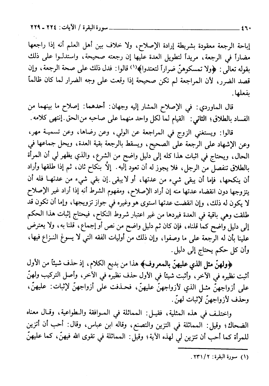 إِبَاحَةَ الرَّجْعَةِ مَعْقُودَةٌ بِشَرِيطَةِ إِرَادَةِ الْإِصْلَاحِ، وَلَا خِلَافَ بَيْنِ أَهْلِ الْعِلْمِ أَنَّهُ إِذَا رَاجَعَهَا مُضَارًّا فِي الرَّجْعَةِ، مُرِيدًا لِتَطْوِيلِ الْعِدَّةِ عَلَيْهَا أَنَّ رَجْعَتَهُ صَحِيحَةٌ، وَاسْتَدَلُّوا عَلَى ذَلِكَ بِقَوْلِهِ تَعَالَى: وَلا تُمْسِكُوهُنَّ ضِراراً لِتَعْتَدُوا «1» قَالُوا: فَدَلَّ ذَلِكَ عَلَى صِحَّةِ الرَّجْعَةِ، وَإِنْ قَصَدَ الضَّرَرَ، لِأَنَّ الْمُرَاجَعَةَ لَمْ تَكُنْ صَحِيحَةً إِذَا وَقَعَتْ عَلَى وَجْهِ الضِّرَارِ لِمَا كَانَ ظَالِمًا بِفِعْلِهَا.