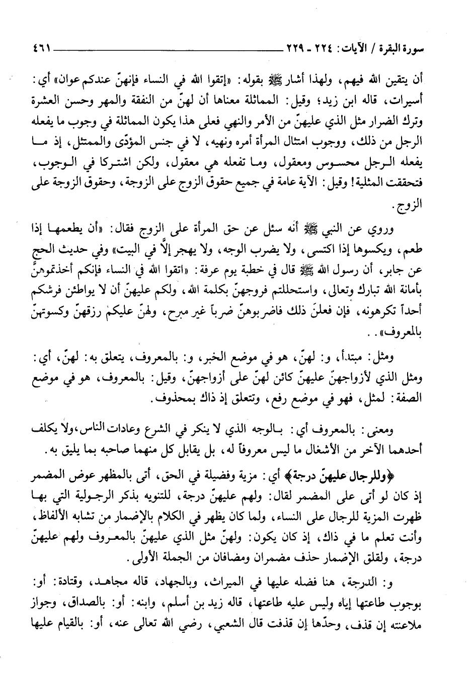 وَلِلرِّجالِ عَلَيْهِنَّ دَرَجَةٌ أَيْ: مَزِيَّةٌ وَفَضِيلَةٌ فِي الْحَقِّ، أَتَى بِالْمُظْهَرِ عِوَضُ الْمُضْمَرِ إِذْ كَانَ لَوْ أَتَى عَلَى الْمُضْمَرِ لَقَالَ: وَلَهُمْ عَلَيْهِنَّ دَرَجَةٌ، لِلتَّنْوِيهِ بِذِكْرِ الرُّجُولِيَّةِ الَّتِي بِهَا ظَهَرَتِ الْمَزِيَّةُ لِلرِّجَالِ عَلَى النِّسَاءِ، وَلِمَا كَانَ يَظْهَرُ فِي الْكَلَامِ بِالْإِضْمَارِ مِنْ تَشَابُهِ الْأَلْفَاظِ، وَأَنْتَ تَعْلَمُ مَا فِي ذَاكَ، إِذْ كَانَ يَكُونُ: وَلَهُنَّ مِثْلُ الَّذِي عَلَيْهِنَّ بِالْمَعْرُوفِ وَلَهُمْ عَلَيْهِنَّ دَرَجَةٌ، وَلِقَلَقِ الْإِضْمَارِ حُذِفَ مُضْمَرَانِ وَمُضَافَانِ مِنَ الجملة الأولى.