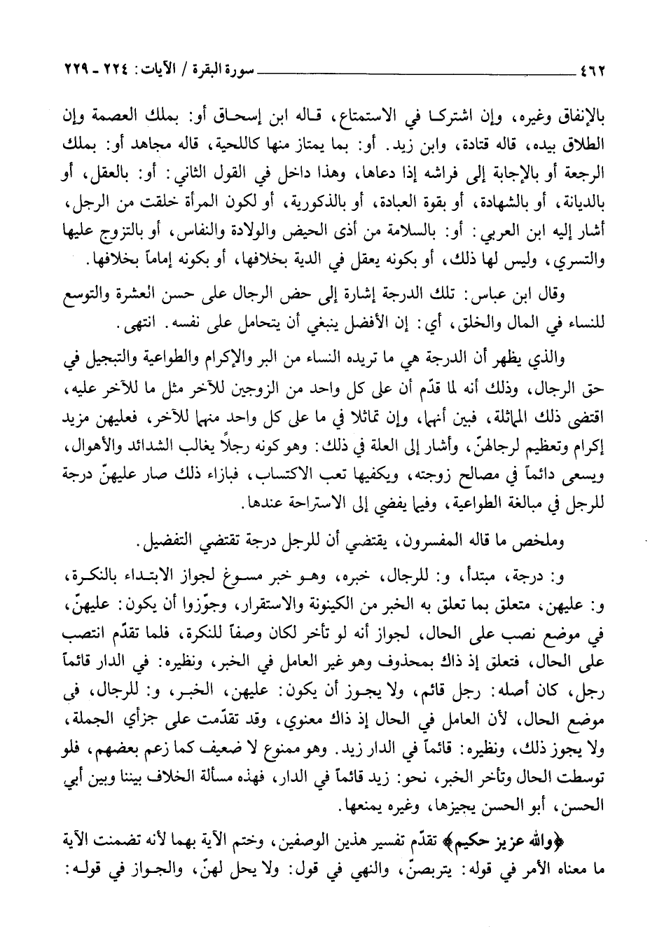 وَمُلَخَّصُ مَا قَالَهُ الْمُفَسِّرُونَ، يَقْتَضِي أَنَّ لِلرَّجُلِ دَرَجَةً تَقْتَضِي التَّفْضِيلَ.