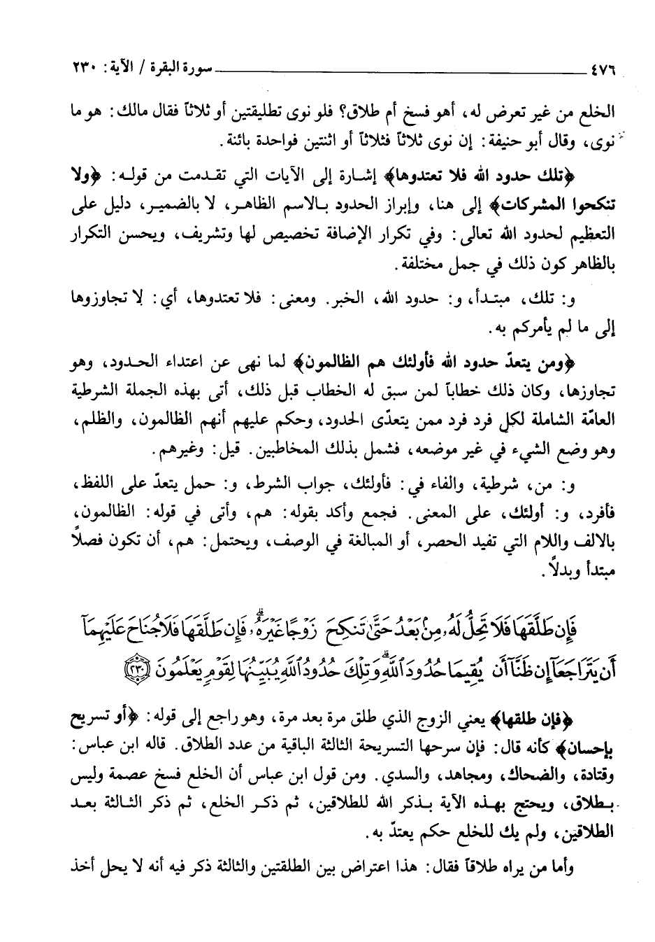 فَإِنْ طَلَّقَها فَلا تَحِلُّ لَهُ مِنْ بَعْدُ حَتَّى تَنْكِحَ زَوْجاً غَيْرَهُ فَإِنْ طَلَّقَها فَلا جُناحَ عَلَيْهِما أَنْ يَتَراجَعا إِنْ ظَنَّا أَنْ يُقِيما حُدُودَ اللَّهِ وَتِلْكَ حُدُودُ اللَّهِ يُبَيِّنُها لِقَوْمٍ يَعْلَمُونَ (230)
