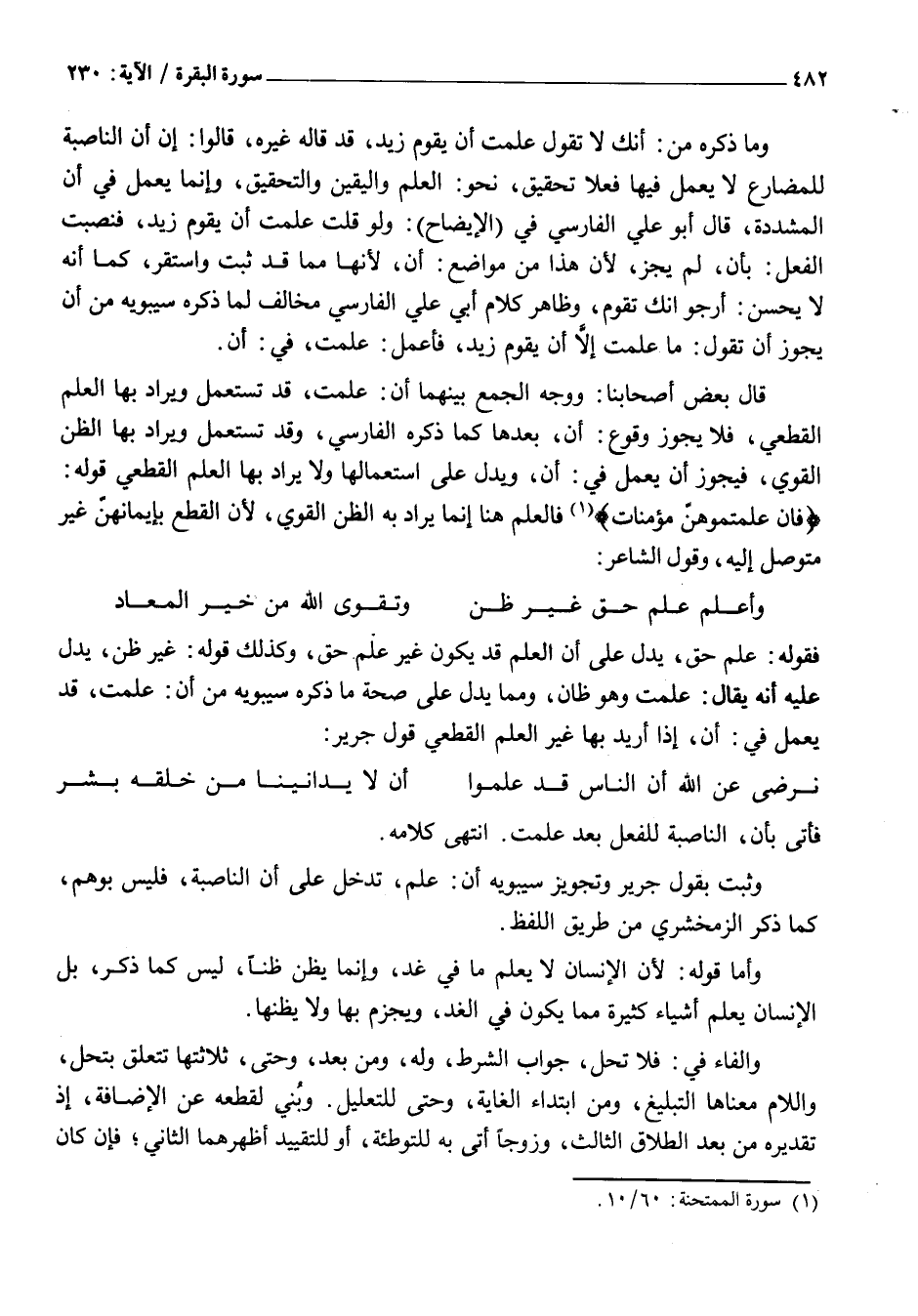 فَقَوْلُهُ: عِلْمَ حَقٍّ، يَدُلُّ عَلَى أَنَّ الْعِلْمَ قَدْ يَكُونُ غَيْرَ عِلْمِ حَقٍّ، وَكَذَلِكَ قَوْلُهُ: غَيْرَ ظَنٍّ، يَدُلُّ عَلَيْهِ أَنَّهُ يُقَالُ: عَلِمْتُ وَهُوَ ظَانٌّ، وَمِمَّا يَدُلُّ عَلَى صِحَّةِ مَا ذَكَرَهُ سِيبَوَيْهِ مِنْ أَنَّ: عَلِمْتُ، قَدْ يَعْمَلُ فِي: أَنْ، إِذَا أُرِيدَ بِهَا غَيْرُ الْعِلْمِ الْقَطْعِيِّ قول جرير: