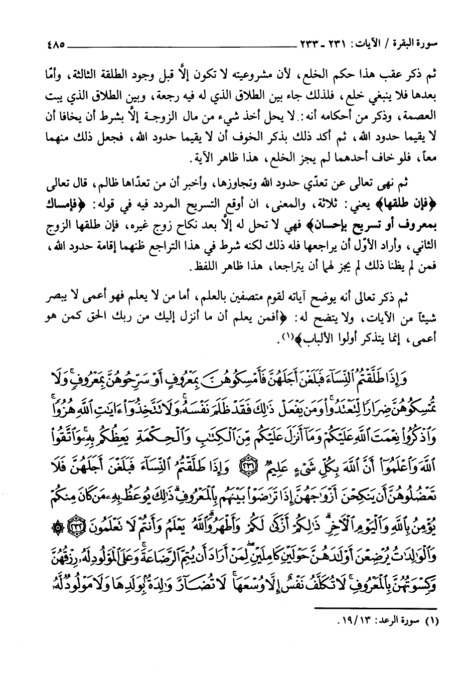 وَإِذا طَلَّقْتُمُ النِّساءَ فَبَلَغْنَ أَجَلَهُنَّ فَأَمْسِكُوهُنَّ بِمَعْرُوفٍ أَوْ سَرِّحُوهُنَّ بِمَعْرُوفٍ وَلا تُمْسِكُوهُنَّ ضِراراً لِتَعْتَدُوا وَمَنْ يَفْعَلْ ذلِكَ فَقَدْ ظَلَمَ نَفْسَهُ وَلا تَتَّخِذُوا آياتِ اللَّهِ هُزُواً وَاذْكُرُوا نِعْمَتَ اللَّهِ عَلَيْكُمْ وَما أَنْزَلَ عَلَيْكُمْ مِنَ الْكِتابِ وَالْحِكْمَةِ يَعِظُكُمْ بِهِ وَاتَّقُوا اللَّهَ وَاعْلَمُوا أَنَّ اللَّهَ بِكُلِّ شَيْءٍ عَلِيمٌ (231) وَإِذا طَلَّقْتُمُ النِّساءَ فَبَلَغْنَ أَجَلَهُنَّ فَلا تَعْضُلُوهُنَّ أَنْ يَنْكِحْنَ أَزْواجَهُنَّ إِذا تَراضَوْا بَيْنَهُمْ بِالْمَعْرُوفِ ذلِكَ يُوعَظُ بِهِ مَنْ كانَ مِنْكُمْ يُؤْمِنُ بِاللَّهِ وَالْيَوْمِ الْآخِرِ ذلِكُمْ أَزْكى لَكُمْ وَأَطْهَرُ وَاللَّهُ يَعْلَمُ وَأَنْتُمْ لَا تَعْلَمُونَ (232) وَالْوالِداتُ يُرْضِعْنَ أَوْلادَهُنَّ حَوْلَيْنِ كامِلَيْنِ لِمَنْ أَرادَ أَنْ يُتِمَّ الرَّضاعَةَ وَعَلَى الْمَوْلُودِ لَهُ رِزْقُهُنَّ وَكِسْوَتُهُنَّ بِالْمَعْرُوفِ لَا تُكَلَّفُ نَفْسٌ إِلاَّ وُسْعَها لَا تُضَارَّ والِدَةٌ بِوَلَدِها وَلا مَوْلُودٌ لَهُ بِوَلَدِهِ وَعَلَى الْوارِثِ مِثْلُ ذلِكَ فَإِنْ أَرادا فِصالاً عَنْ تَراضٍ مِنْهُما وَتَشاوُرٍ فَلا جُناحَ عَلَيْهِما وَإِنْ أَرَدْتُمْ أَنْ تَسْتَرْضِعُوا أَوْلادَكُمْ فَلا جُناحَ عَلَيْكُمْ إِذا سَلَّمْتُمْ مَا آتَيْتُمْ بِالْمَعْرُوفِ وَاتَّقُوا اللَّهَ وَاعْلَمُوا أَنَّ اللَّهَ بِما تَعْمَلُونَ بَصِيرٌ (233)