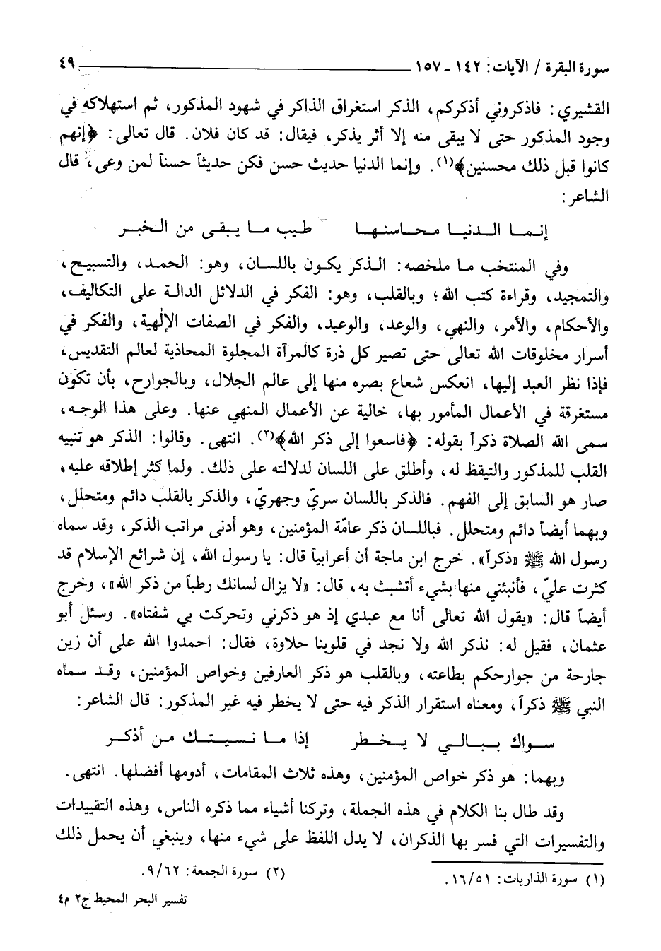 الْقُشَيْرِيُّ: فَاذْكُرُونِي أَذْكُرْكُمْ، الذِّكْرُ اسْتِغْرَاقُ الذَّاكِرِ فِي شُهُودِ الْمَذْكُورِ، ثُمَّ اسْتِهْلَاكُهُ فِي وُجُودِ الْمَذْكُورِ حَتَّى لَا يَبْقَى مِنْهُ إِلَّا أَثَرٌ يُذْكَرُ، فَيُقَالُ: قَدْ كَانَ فُلَانٌ. قَالَ تَعَالَى: إِنَّهُمْ كانُوا قَبْلَ ذلِكَ مُحْسِنِينَ «1» . وَإِنَّمَا الدُّنْيَا حَدِيثٌ حَسَنٌ فَكُنْ حَدِيثًا حَسَنًا لِمَنْ وَعَى، قَالَ الشَّاعِرُ: