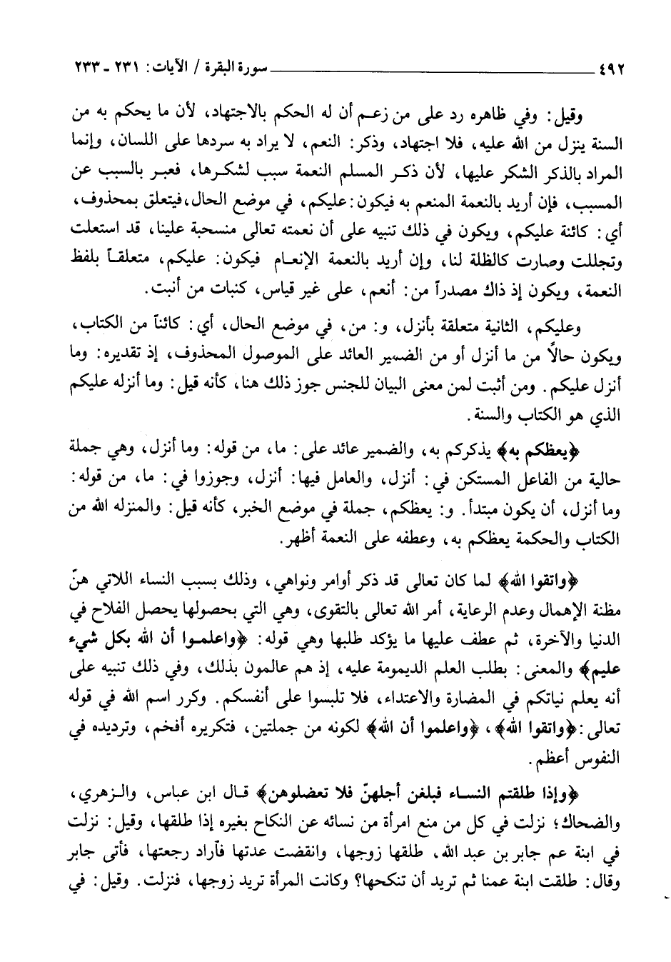 وَمَا أَنْزَلَ، أَنْ يَكُونَ مُبْتَدَأً. وَ: يَعِظُكُمْ، جُمْلَةٌ فِي مَوْضِعِ الْخَبَرِ، كَأَنَّهُ قِيلَ: والمنزل اللَّهُ مِنَ الْكِتَابِ وَالْحِكْمَةِ يَعِظُكُمْ بِهِ، وَعَطْفُهُ عَلَى النِّعْمَةِ أَظْهَرُ.