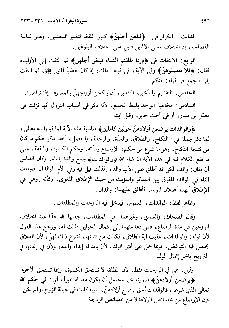 وَالْوالِداتُ يُرْضِعْنَ أَوْلادَهُنَّ حَوْلَيْنِ كامِلَيْنِ مُنَاسَبَةُ هَذِهِ الْآيَةِ لِمَا قَبْلَهَا أَنَّهُ تَعَالَى، لَمَّا ذكر جُمْلَةً فِي: النِّكَاحِ، وَالطَّلَاقِ، وَالْعِدَّةِ، وَالرَّجْعَةِ، وَالْعَضْلِ، أَخَذَ يَذْكُرُ حُكْمَ مَا كَانَ مِنْ نَتِيجَةِ النِّكَاحِ، وَهُوَ مَا شُرِعَ مِنْ حُكْمِ: الْإِرْضَاعِ وَمُدَّتِهِ، وَحُكْمِ الْكُسْوَةِ، وَالنَّفَقَةِ، عَلَى مَا يَقَعُ الْكَلَامُ فِيهِ فِي هَذِهِ الْآيَةِ إِنْ شَاءَ اللَّهُ وَالْوالِداتُ جَمْعُ وَالِدَةٍ بِالتَّاءِ، وَكَانَ الْقِيَاسُ أَنْ يُقَالَ: وَالِدٌ، لَكِنْ قَدْ أَطْلَقَ عَلَى الْأَبِ وَالِدٌ، وَلِذَلِكَ قِيلَ فِيهِ وَفِي الْأُمِّ الوالدان فَجَاءَتِ التَّاءُ فِي الْوَالِدَةِ لِلْفَرْقِ بَيْنَ الْمُذَكَّرِ وَالْمُؤَنَّثِ مِنْ حَيْثُ الْإِطْلَاقِ اللُّغَوِيِّ، وَكَأَنَّهُ رُوعِيَ فِي الْإِطْلَاقِ أَنَّهُمَا أَصْلَانِ لِلْوَلَدِ، فَأُطْلِقَ عَلَيْهِمَا: وَالِدَانِ.
