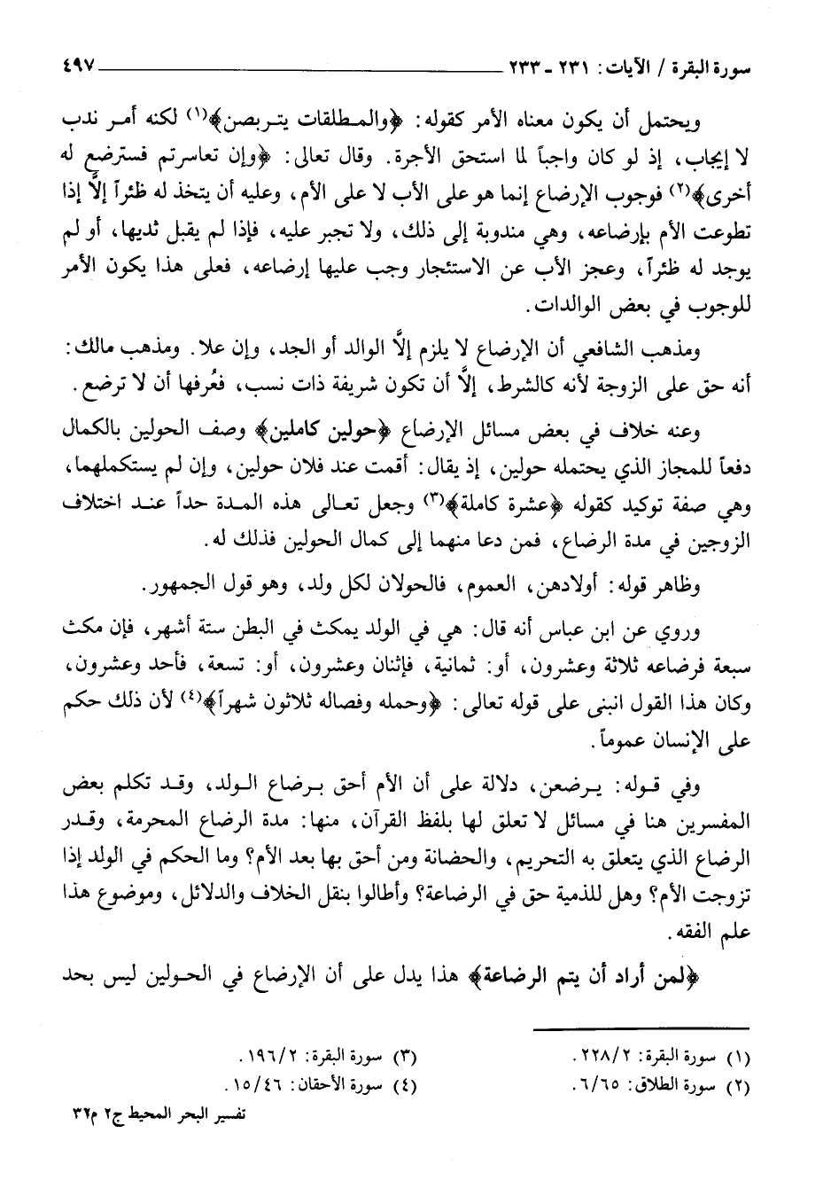 وَفِي قَوْلِهِ: يُرْضِعْنَ، دَلَالَةٌ عَلَى أَنَّ الْأُمَّ أَحَقُّ بِرَضَاعِ الْوَلَدِ، وَقَدْ تَكَلَّمَ بَعْضُ الْمُفَسِّرِينَ هُنَا فِي مَسَائِلَ لَا تَعَلُّقَ لَهَا بِلَفْظِ الْقُرْآنِ، مِنْهَا: مُدَّةُ الرَّضَاعِ الْمُحَرِّمَةِ، وَقَدْرُ الرَّضَاعِ الَّذِي يَتَعَلَّقُ بِهِ التَّحْرِيمُ، وَالْحَضَانَةُ وَمَنْ أَحَقُّ بِهَا بَعْدَ الْأُمِّ؟ وَمَا الْحُكْمُ فِي الْوَلَدِ إِذَا تَزَوَّجَتِ الْأُمُّ؟ وَهَلْ لِلذِّمِّيَّةِ حَقٌّ فِي الرَّضَاعَةِ؟ وَأَطَالُوا بِنَقْلِ الْخِلَافِ وَالدَّلَائِلِ، وَمَوْضُوعُ هَذَا عِلْمُ الْفِقْهِ.