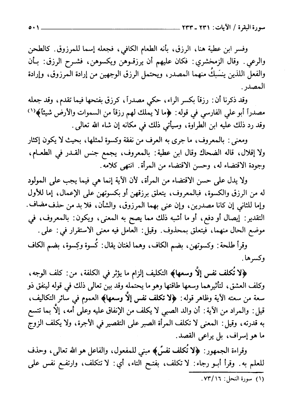 لَا تُكَلَّفُ نَفْسٌ إِلَّا وُسْعَها التَّكْلِيفُ إِلْزَامُ مَا يُؤْثَرُ فِي الْكُلْفَةِ، مِنْ: كَلِفَ الْوَجْهُ، وَكَلِفَ الْعِشْقُ، لِتَأْثِيرِهِمَا وُسْعَهَا طَاقَتَهَا وَهُوَ مَا يَحْتَمِلُهُ وَقَدْ بَيَّنَ تَعَالَى ذَلِكَ فِي قَوْلِهِ لِيُنْفِقْ ذُو سَعَةٍ مِنْ سَعَتِهِ الْآيَةَ وَظَاهِرُ قَوْلِهِ: لَا تُكَلَّفُ نَفْسٌ إِلَّا وُسْعَها الْعُمُومُ فِي سَائِرِ التَّكَالِيفِ، قِيلَ: وَالْمُرَادُ مِنَ الْآيَةِ: أَنَّ وَالِدَ الصَّبِيِّ لَا يُكَلَّفُ مِنَ الْإِنْفَاقِ عَلَيْهِ وَعَلَى أُمِّهِ، إِلَّا بِمَا تَتَّسِعُ بِهِ قُدْرَتُهُ، وَقِيلَ: الْمَعْنَى لَا تُكَلَّفُ الْمَرْأَةُ الصَّبْرَ عَلَى التَّقْصِيرِ فِي الْأُجْرَةِ، وَلَا يُكَلَّفُ الزَّوْجُ مَا هُوَ إِسْرَافٌ، بَلْ يُرَاعَى الْقَصْدُ.