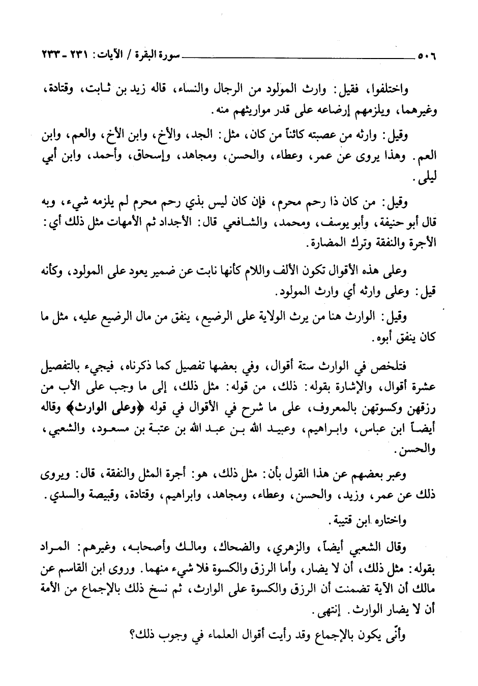 وَقَالَ الشَّعْبِيُّ أَيْضًا، وَالزُّهْرِيُّ، وَالضَّحَّاكُ، وَمَالِكٌ وَأَصْحَابُهُ، وَغَيْرُهُمْ: الْمُرَادُ بِقَوْلِهِ: مِثْلُ ذَلِكَ، أَنْ لَا يُضَارَّ، وَأَمَّا الرِّزْقُ وَالْكِسْوَةُ فَلَا شَيْءَ مِنْهُمَا. وَرَوَى ابْنُ الْقَاسِمِ عَنْ مالك إن الْآيَةَ تَضَمَّنَتْ أَنَّ الرِّزْقَ وَالْكِسْوَةَ عَلَى الْوَارِثِ، ثُمَّ نُسِخَ ذَلِكَ بِالْإِجْمَاعِ مِنَ الْأُمَّةِ أَنْ لَا يُضَارَّ الْوَارِثُ. انْتَهَى.