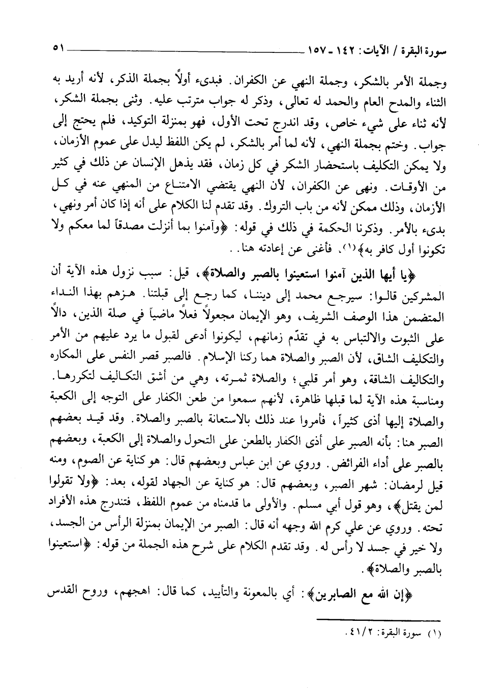 وَمُنَاسَبَةُ هَذِهِ الْآيَةِ لِمَا قَبْلَهَا ظَاهِرَةٌ، لِأَنَّهُمْ سَمِعُوا مِنْ طَعْنِ الْكُفَّارِ عَلَى التَّوَجُّهِ إِلَى الْكَعْبَةِ وَالصَّلَاةِ إِلَيْهَا أَذًى كَثِيرًا، فَأُمِرُوا عِنْدَ ذَلِكَ بِالِاسْتِعَانَةِ بِالصَّبْرِ وَالصَّلَاةِ. وَقَدْ قَيَّدَ بَعْضُهُمُ الصَّبْرَ هُنَا: بِأَنَّهُ الصَّبْرُ عَلَى أَذَى الْكُفَّارِ بِالطَّعْنِ عَلَى التَّحَوُّلِ وَالصَّلَاةِ إِلَى الْكَعْبَةِ، وَبَعْضُهُمْ بِالصَّبْرِ عَلَى أَدَاءِ الْفَرَائِضِ. وَرُوِيَ عَنِ ابْنِ عَبَّاسٍ وَبَعْضِهِمْ قَالَ: هُوَ كِنَايَةٌ عَنِ الصَّوْمِ، وَمِنْهُ قِيلَ لِرَمَضَانَ: شَهْرُ الصَّبْرِ، وَبَعْضُهُمْ قَالَ: هُوَ كِنَايَةٌ عَنِ الْجِهَادِ لِقَوْلِهِ، بَعْدُ: وَلا تَقُولُوا لِمَنْ يُقْتَلُ، وَهُوَ قَوْلُ أَبِي مُسْلِمٍ. وَالْأَوْلَى مَا قَدَّمْنَاهُ مِنْ عُمُومِ اللَّفْظِ، فَتَنْدَرِجُ هَذِهِ الْأَفْرَادُ تَحْتَهُ.