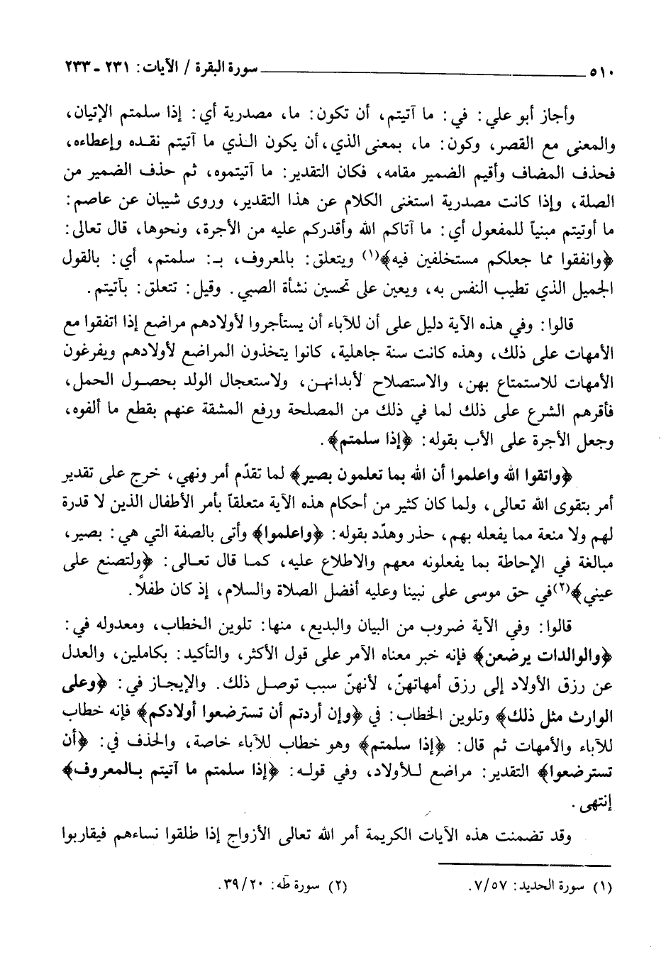وَالْوالِداتُ يُرْضِعْنَ فَإِنَّهُ خَبَرٌ مَعْنَاهُ الْأَمْرُ عَلَى قَوْلِ الْأَكْثَرِ، والتأكيد: بكاملين، وَالْعَدْلُ عَنْ رِزْقِ الْأَوْلَادِ إِلَى رِزْقِ أُمَّهَاتِهِنَّ، لِأَنَّهُنَّ سَبَبُ تَوَصُّلِ ذَلِكَ. وَالْإِيجَازُ فِي: وَعَلَى الْوارِثِ مِثْلُ ذلِكَ وَتَلْوِينُ الْخِطَابِ: فِي وَإِنْ أَرَدْتُمْ أَنْ تَسْتَرْضِعُوا أَوْلادَكُمْ فَإِنَّهُ خِطَابٌ لِلْآبَاءِ وَالْأُمَّهَاتِ ثُمَّ قَالَ: إِذا سَلَّمْتُمْ وَهُوَ خِطَابٌ لِلْآبَاءِ خَاصَّةً، وَالْحَذْفُ فِي: أَنْ تَسْتَرْضِعُوا التَّقْدِيرُ: مَرَاضِعَ لِلْأَوْلَادِ، وَفِي قَوْلِهِ: إِذا سَلَّمْتُمْ مَا آتَيْتُمْ بِالْمَعْرُوفِ انْتَهَى.