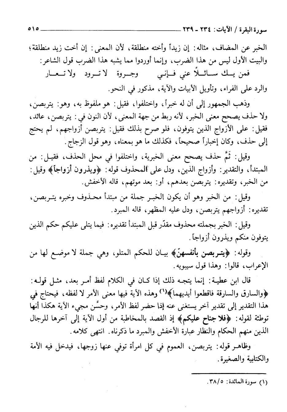 وَالسَّارِقُ وَالسَّارِقَةُ فَاقْطَعُوا أَيْدِيَهُما «1» وَهَذِهِ الْآيَةُ فِيهَا مَعْنَى الْأَمْرِ لَا لَفْظُهُ، فَيَحْتَاجُ فِي هَذَا التَّقْدِيرِ إِلَى تَقْدِيرٍ آخَرَ يُسْتَغْنَى عَنْهُ إِذَا حَضَرَ لَفْظُ الْأَمْرِ، وَحَسُنَ مَجِيءُ الْآيَةِ هَكَذَا أَنَّهَا تَوْطِئَةٌ لِقَوْلِهِ: فَلا جُناحَ عَلَيْكُمْ إِذِ الْقَصْدُ بِالْمُخَاطَبَةِ مِنْ أَوَّلِ الْآيَةِ إِلَى آخِرِهَا لِلرِّجَالِ الَّذِينَ مِنْهُمُ الْحُكَّامُ وَالنُّظَّارُ عِبَارَةُ الْأَخْفَشِ وَالْمُبَرِّدِ مَا ذَكَرْنَاهُ. انْتَهَى كلامه.