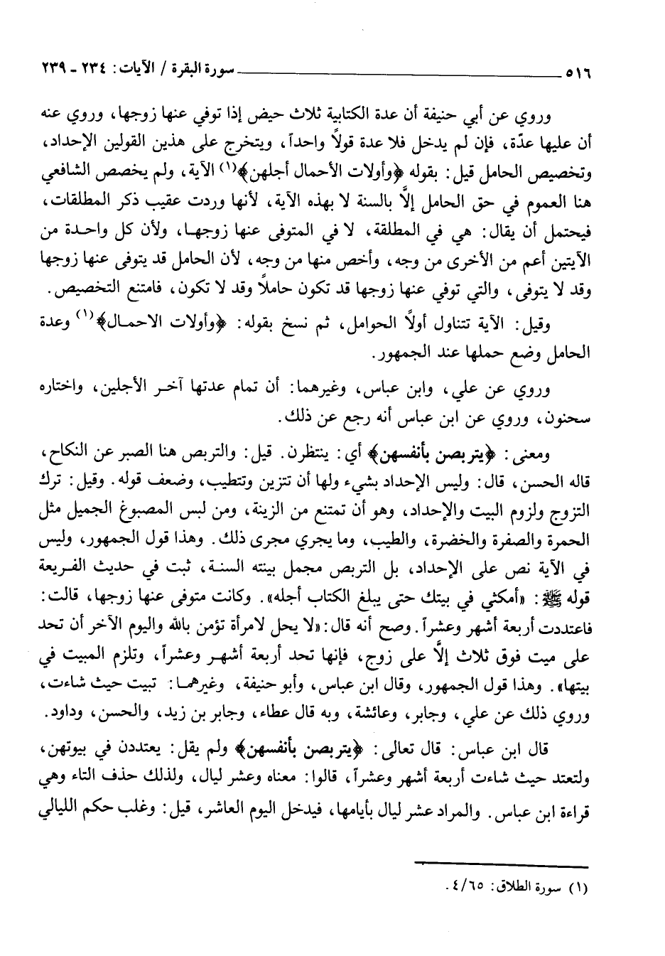 وَمَعْنَى: يَتَرَبَّصْنَ بِأَنْفُسِهِنَّ أَيْ: يَنْتَظِرْنَ. قِيلَ: وَالتَّرَبُّصُ هُنَا الصَّبْرُ عَنِ النِّكَاحِ، قَالَهُ الْحَسَنُ، قَالَ: وَلَيْسَ الْإِحْدَادُ بِشَيْءٍ وَلَهَا أَنْ تَتَزَيَّنَ وَتَتَطَيَّبَ، وَضُعِّفَ قَوْلُهُ. وَقِيلَ: تَرْكُ التَّزَوُّجِ وَلُزُومُ الْبَيْتِ وَالْإِحْدَادُ، وَهُوَ أَنْ تَمْتَنِعَ مِنَ الزِّينَةِ، وَمِنْ لُبْسِ الْمَصْبُوغِ الْجَمِيلِ مِثْلَ الْحُمْرَةِ وَالصُّفْرَةِ وَالْخُضْرَةِ، وَالطِّيبِ، وَمَا يَجْرِي مَجْرَى ذَلِكَ. وَهَذَا قَوْلُ الْجُمْهُورِ، وَلَيْسَ فِي الْآيَةِ نَصٌّ عَلَى الْإِحْدَادِ، بَلِ التَّرَبُّصُ مُجْمَلٌ بَيَّنَتْهُ السُّنَّةُ، ثَبَتَ