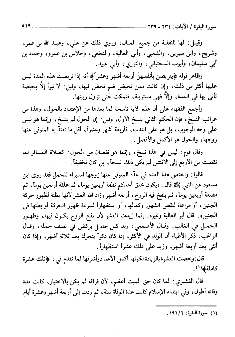 وَأَجْمَعَ الْفُقَهَاءُ عَلَى أَنَّ هَذِهِ الْآيَةَ ناسخة لِمَا بَعْدَهَا مِنَ الِاعْتِدَادِ بِالْحَوْلِ، وَهَذَا مِنْ غَرَائِبِ النَّسْخِ، فَإِنَّ الْحُكْمَ الثَّانِيَ يَنْسَخُ الْأَوَّلَ، وَقِيلَ: إِنَّ الْحَوْلَ لَمْ يُنْسَخْ، وَإِنَّمَا هُوَ لَيْسَ عَلَى وَجْهِ الْوُجُوبِ، بَلْ هُوَ عَلَى النَّدْبِ، فَأَرْبَعَةُ أَشْهُرٍ وَعَشْرًا، أَقَلُّ مَا تَعْتَدُّ بِهِ الْمُتَوَفَّى عَنْهَا زَوْجُهَا، وَالْحَوْلُ هُوَ الْأَكْمَلُ وَالْأَفْضَلُ.