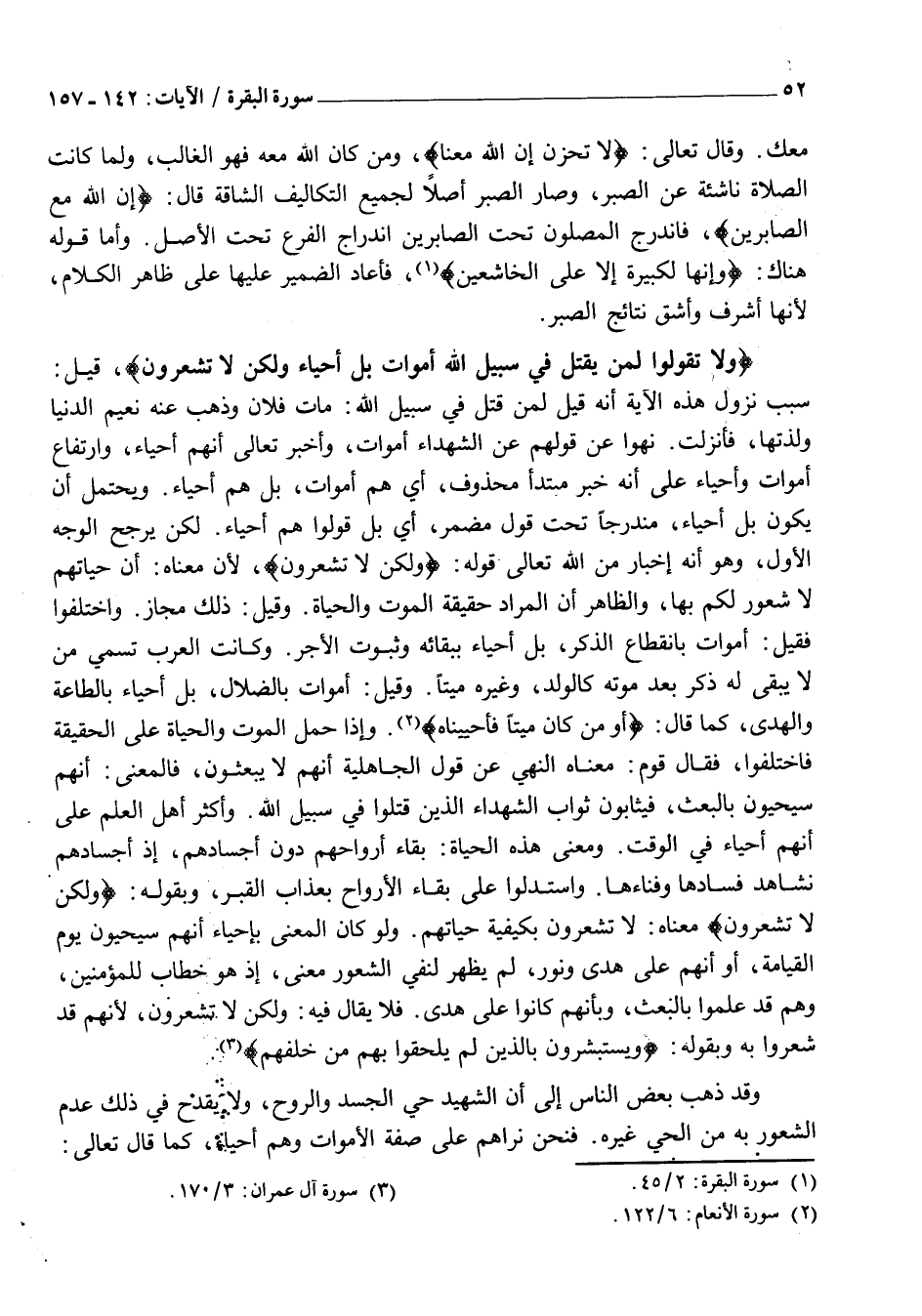 وَلا تَقُولُوا لِمَنْ يُقْتَلُ فِي سَبِيلِ اللَّهِ أَمْواتٌ بَلْ أَحْياءٌ وَلكِنْ لَا تَشْعُرُونَ، قِيلَ: