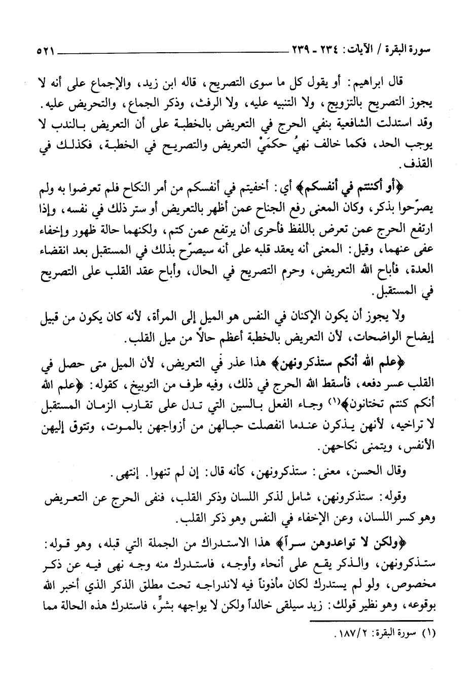 وَلَا يَجُوزُ أَنْ يَكُونَ الْإِكْنَانُ فِي النَّفْسِ هُوَ الْمَيْلُ إِلَى الْمَرْأَةِ، لِأَنَّهُ كَانَ يَكُونُ مِنْ قَبِيلِ إِيضَاحِ الْوَاضِحَاتِ، لِأَنَّ التَّعْرِيضَ بِالْخِطْبَةِ أَعْظَمُ حَالًا مِنْ مَيْلِ الْقَلْبِ.