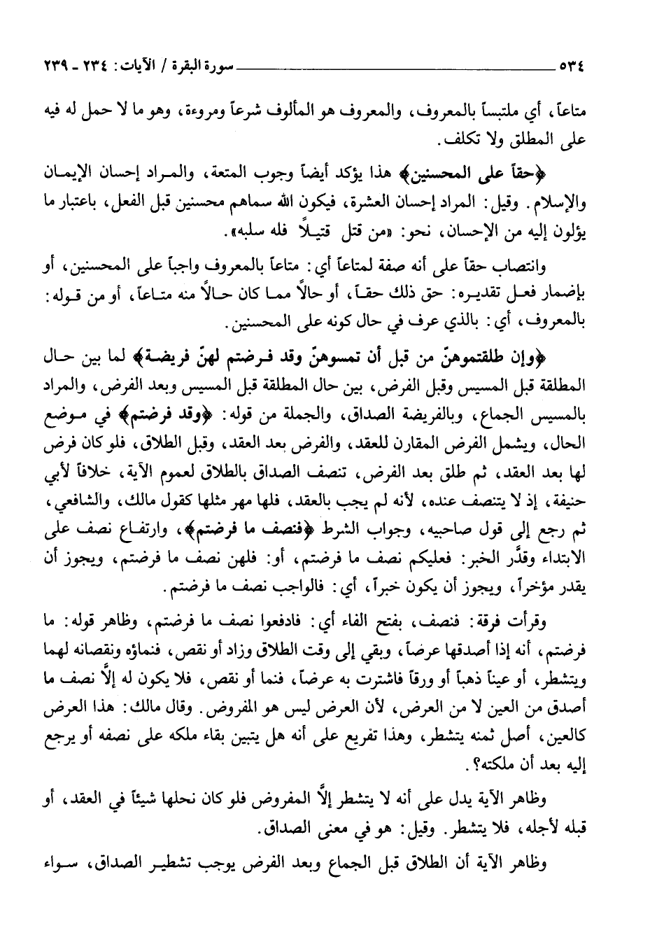 وَإِنْ طَلَّقْتُمُوهُنَّ مِنْ قَبْلِ أَنْ تَمَسُّوهُنَّ وَقَدْ فَرَضْتُمْ لَهُنَّ فَرِيضَةً لَمَّا بَيَّنَ حَالَ الْمُطَلَّقَةِ قَبْلَ الْمَسِيسِ وَقَبْلَ الْفَرْضِ، بَيَّنَ حَالَ الْمُطَلَّقَةِ قَبْلَ الْمَسِيسِ وَبَعْدَ الْفَرْضِ، وَالْمُرَادُ بِالْمَسِيسِ الْجِمَاعُ، وَبِالْفَرِيضَةِ الصَّدَاقُ، وَالْجُمْلَةُ مِنْ قَوْلِهِ: وَقَدْ فَرَضْتُمْ فِي مَوْضِعِ الْحَالِ، وَيَشْمَلُ الْفَرْضَ الْمُقَارِنَ لِلْعَقْدِ، وَالْفَرْضَ بَعْدَ الْعَقْدِ، وَقَبْلَ الطَّلَاقِ، فَلَوْ كَانَ فَرَضَ لَهَا بَعْدَ الْعَقْدِ، ثُمَّ طَلَّقَ بَعْدَ الْفَرْضِ، تَنَصَّفَ الصَّدَاقُ بِالطَّلَاقِ لِعُمُومِ الْآيَةِ، خِلَافًا لِأَبِي حَنِيفَةَ، إِذْ لَا يَتَنَصَّفُ عِنْدَهُ، لِأَنَّهُ لَمْ يَجِبْ بِالْعَقْدِ، فَلَهَا مَهْرُ مِثْلِهَا كَقَوْلِ مَالِكٍ، وَالشَّافِعِيِّ، ثُمَّ رَجَعَ إِلَى قَوْلِ صَاحِبَيْهِ، وَجَوَابُ الشَّرْطِ فَنِصْفُ مَا فَرَضْتُمْ، وَارْتِفَاعُ نِصْفُ عَلَى الِابْتِدَاءِ وَقُدِّرَ الْخَبَرُ: فَعَلَيْكُمْ نِصْفُ مَا فَرَضْتُمْ، أَوْ: فَلَهُنَّ نِصْفُ مَا فَرَضْتُمْ، وَيَجُوزُ أَنْ يُقَدَّرَ مُؤَخَّرًا، وَيَجُوزُ أَنْ يَكُونَ خَبَرًا، أَيْ: فَالْوَاجِبُ نِصْفُ مَا فَرَضْتُمْ.