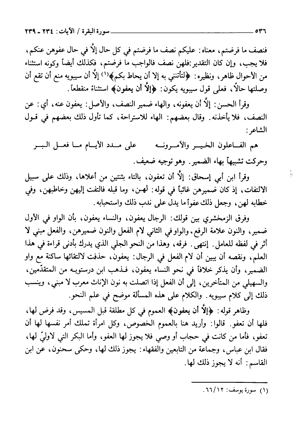 وَفَرَّقَ الزَّمَخْشَرِيُّ بَيْنَ قَوْلِكَ: الرِّجَالُ يَعْفُونَ، وَالنِّسَاءُ يَعْفُونَ، بِأَنَّ الْوَاوَ فِي الْأَوَّلِ ضَمِيرٌ، وَالنُّونَ عَلَامَةُ الرَّفْعِ، وَالْوَاوَ فِي الثَّانِي لَامُ الْفِعْلِ وَالنُّونَ ضَمِيرُهُنَّ، وَالْفِعْلُ مَبْنِيٌّ لَا أَثَرَ فِي لَفْظِهِ لِلْعَامِلِ. انْتَهَى. فَرْقُهُ، وَهَذَا مِنَ النَّحْوِ الْجَلِيِّ الَّذِي يُدْرَكُ بِأَدْنَى قِرَاءَةٍ فِي هَذَا الْعِلْمِ، وَنَقَصَهُ أَنْ يُبَيِّنَ أَنَّ لَامَ الْفِعْلِ فِي الرِّجَالُ: يَعْفُونَ، حُذِفَتْ لِالْتِقَائِهَا سَاكِنَةً مَعَ وَاوِ الضَّمِيرِ، وَأَنْ يَذْكُرَ خِلَافًا فِي نَحْوِ النِّسَاءُ يَعْفُونَ، فَذَهَبَ ابْنُ دَرَسْتَوَيْهِ مِنَ الْمُتَقَدِّمِينَ، وَالسُّهَيْلِيُّ مِنَ الْمُتَأَخِّرِينَ، إِلَى أَنَّ الْفِعْلَ إِذَا اتَّصَلَتْ بِهِ نُونُ الْإِنَاثِ مُعْرَبٌ لَا مَبْنِيٌّ، وَيُنْسَبُ ذَلِكَ إِلَى كَلَامِ سِيبَوَيْهِ. وَالْكَلَامُ عَلَى هَذِهِ الْمَسْأَلَةِ مُوَضَّحٌ فِي عِلْمِ النَّحْوِ.