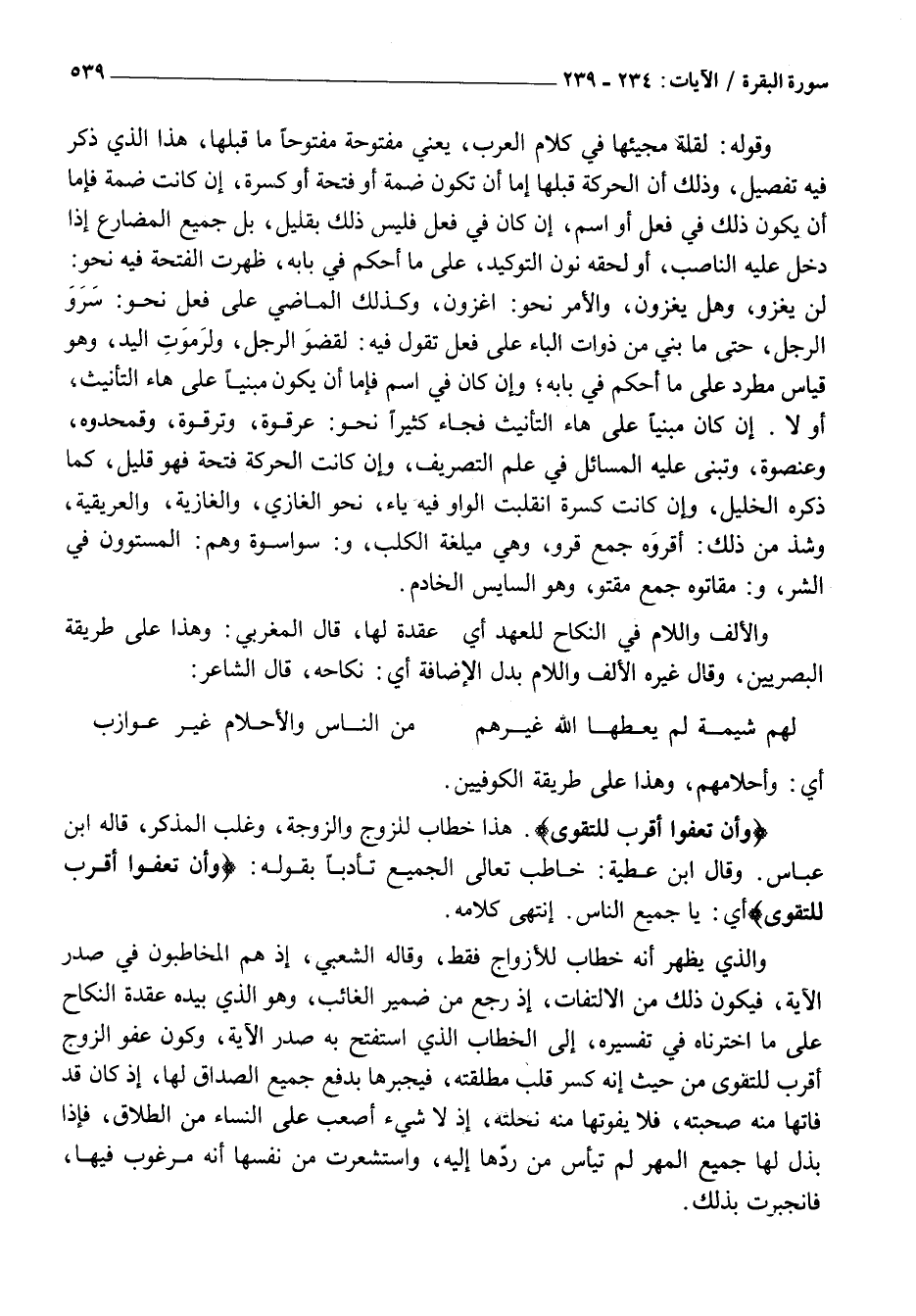وَالَّذِي يَظْهَرُ أَنَّهُ خِطَابٌ لِلْأَزْوَاجِ فَقَطْ، وَقَالَهُ الشعبي، إذ هُمُ الْمُخَاطَبُونَ فِي صَدْرِ الْآيَةِ، فَيَكُونُ ذَلِكَ مِنَ الِالْتِفَاتِ، إِذْ رَجَعَ مِنْ ضَمِيرِ الْغَائِبِ، وَهُوَ الَّذِي بِيَدِهِ عُقْدَةُ النِّكَاحِ عَلَى مَا اخْتَرْنَاهُ فِي تَفْسِيرِهِ، إِلَى الْخِطَابِ الَّذِي اسْتَفْتَحَ بِهِ صَدْرَ الْآيَةِ، وَكَوْنُ عَفْوِ الزَّوْجِ أَقْرَبَ لِلتَّقْوَى مِنْ حَيْثُ إِنَّهُ كَسَرَ قَلْبَ مُطَلَّقَتِهِ، فَيَجْبُرُهَا بِدَفْعِ جَمِيعِ الصَّدَاقِ لَهَا، إِذْ كَانَ قَدْ فَاتَهَا مِنْهُ صُحْبَتُهُ، فَلَا يَفُوتُهَا مِنْهُ نِحْلَتُهُ، إِذْ لَا شَيْءَ أَصْعَبُ عَلَى النِّسَاءِ مِنَ الطَّلَاقِ، فَإِذَا بَذَلَ لَهَا جَمِيعَ الْمَهْرِ لَمْ تَيْأَسْ مِنْ رَدِّهَا إِلَيْهِ، وَاسْتَشْعَرَتْ مِنْ نَفْسِهَا أَنَّهُ مَرْغُوبٌ فِيهَا، فَانْجَبَرَتْ بِذَلِكَ.