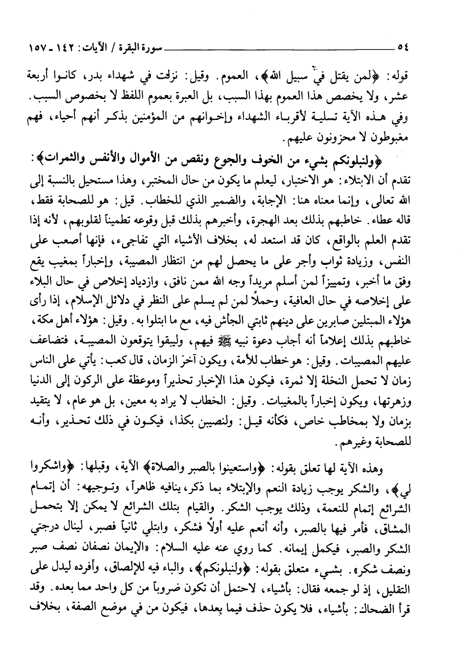 تَقَدَّمَ أَنَّ الِابْتِلَاءَ: هُوَ الِاخْتِبَارُ، لِيُعْلَمُ مَا يَكُونُ مِنْ حَالِ الْمُخْتَبَرِ، وَهَذَا مُسْتَحِيلٌ بِالنِّسْبَةِ إِلَى اللَّهِ تَعَالَى، وَإِنَّمَا مَعْنَاهُ هُنَا: الْإِجَابَةُ، وَالضَّمِيرُ الَّذِي لِلْخِطَابِ. قِيلَ: هُوَ لِلصَّحَابَةِ فَقَطْ، قَالَهُ عَطَاءٌ. خَاطَبَهُمْ بِذَلِكَ بَعْدَ الْهِجْرَةِ، وَأَخْبَرَهُمْ بِذَلِكَ قَبْلَ وُقُوعِهِ تَطْمِينًا لِقُلُوبِهِمْ، لِأَنَّهُ إِذَا تَقَدَّمَ الْعِلْمُ بِالْوَاقِعِ، كَانَ قَدِ اسْتَعَدَّ لَهُ، بِخِلَافِ الْأَشْيَاءِ الَّتِي تُفَاجِئُ، فَإِنَّهَا أَصْعَبُ عَلَى النَّفْسِ، وَزِيَادَةَ ثَوَابٍ وَأَجْرٍ عَلَى ما يحصل لهم من انْتِظَارِ الْمُصِيبَةِ، وَإِخْبَارًا بِمُغَيَّبٍ يَقَعُ وَفْقَ مَا أَخْبَرَ، وَتَمْيِيزًا لِمَنْ أَسْلَمَ مُرِيدًا وَجْهَ اللَّهِ مِمَّنْ نَافَقَ، وَازْدِيَادَ إِخْلَاصٍ فِي حَالِ الْبَلَاءِ عَلَى إِخْلَاصِهِ فِي حَالِ الْعَافِيَةِ، وَحَمْلًا لِمَنْ لَمْ يُسْلِمْ عَلَى النَّظَرِ في دلائل الإسلام، إذا رَأَى هَؤُلَاءِ الْمُبْتَلِينَ صَابِرِينَ عَلَى دِينِهِمْ ثَابِتِي الْجَأْشِ فِيهِ، مَعْ مَا ابْتُلُوا بِهِ. وَقِيلَ: هَؤُلَاءِ أَهْلُ مَكَّةَ، خَاطَبَهُمْ بِذَلِكَ إِعْلَامًا أَنَّهُ أَجَابَ دَعْوَةَ نَبِيَّهُ صَلَّى اللَّهُ عَلَيْهِ وسلم فِيهِمْ، وَلِيَبْقُوا يَتَوَقَّعُونَ الْمُصِيبَةَ، فَتُضَاعَفُ عَلَيْهِمُ الْمُصِيبَاتُ. وَقِيلَ: هُوَ خِطَابٌ لِلْأُمَّةِ، وَيَكُونُ آخِرَ الزَّمَانِ، قَالَ كَعْبٌ: يَأْتِي عَلَى النَّاسِ زَمَانٌ لَا تَحْمِلُ النَّخْلَةُ إِلَّا ثمرة، فيكون هَذَا الْإِخْبَارُ تَحْذِيرًا وَمَوْعِظَةً عَلَى الرُّكُونِ إِلَى الدُّنْيَا وَزَهْرَتِهَا، وَيَكُونُ إِخْبَارًا بِالْمُغَيَّبَاتِ. وَقِيلَ: الْخِطَابُ لَا يُرَادُ بِهِ مُعَيَّنٌ، بَلْ هُوَ عَامٌّ، لَا يَتَقَيَّدُ بِزَمَانٍ وَلَا بِمُخَاطَبٍ خَاصٍّ، فَكَأَنَّهُ قِيلَ: وَلَنُصِيبَنَّ بِكَذَا، فَيَكُونُ فِي ذَلِكَ تَحْذِيرٌ، وَأَنَّهُ لِلصَّحَابَةِ وَغَيْرِهِمْ.
