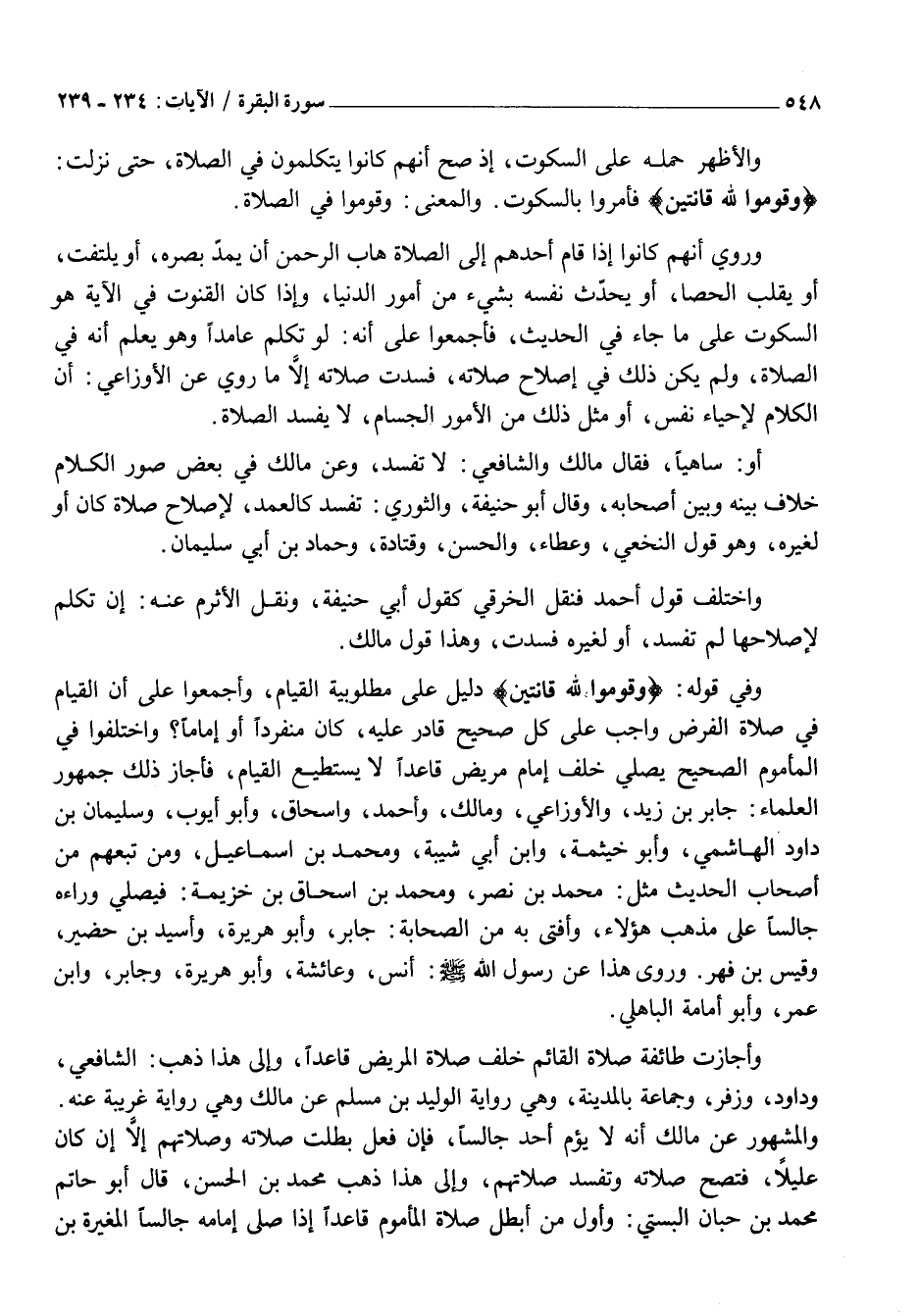 وَفِي قَوْلِهِ: وَقُومُوا لِلَّهِ قانِتِينَ دَلِيلٌ عَلَى مَطْلُوبِيَّةِ الْقِيَامِ، وَأَجْمَعُوا عَلَى أَنَّ الْقِيَامَ فِي صَلَاةِ الْفَرْضِ وَاجِبٌ عَلَى كُلِّ صَحِيحٍ قَادِرٍ عَلَيْهِ، كَانَ مُنْفَرِدًا أَوْ إِمَامًا؟ وَاخْتَلَفُوا فِي الْمَأْمُومِ الصَّحِيحِ يُصَلِّي خَلْفَ إِمَامٍ مَرِيضٍ قَاعِدًا لَا يَسْتَطِيعُ الْقِيَامَ، فَأَجَازَ ذَلِكَ جُمْهُورُ الْعُلَمَاءِ: جَابِرُ بْنُ زَيْدٍ، وَالْأَوْزَاعِيُّ، وَمَالِكٌ، وَأَحْمَدُ، وَإِسْحَاقُ، وَأَبُو أَيُّوبَ، وَسُلَيْمَانُ بْنُ دَاوُدَ الْهَاشِمِيُّ، وَأَبُو خَيْثَمَةَ، وَابْنُ أَبِي شَيْبَةَ، وَمُحَمَّدُ بْنُ إِسْمَاعِيلَ، وَمَنْ تَبِعَهُمْ مِنْ أَصْحَابِ الْحَدِيثِ مِثْلُ: مُحَمَّدِ بْنِ نَصْرٍ، وَمُحَمَّدِ بْنِ إِسْحَاقَ بْنِ خُزَيْمَةَ: فَيُصَلِّي وَرَاءَهُ جَالِسًا عَلَى مَذْهَبِ هَؤُلَاءِ، وَأَفْتَى بِهِ مِنَ الصَّحَابَةِ: جَابِرٌ، وَأَبُو هُرَيْرَةَ، وَأُسَيْدُ بْنُ حُضَيْرٍ، وَقَيْسُ بْنُ فِهْرٍ. وَرَوَى هَذَا عَنْ رَسُولِ اللَّهِ صَلَّى اللَّهُ عَلَيْهِ وَسَلَّمَ: أَنَسٌ، وَعَائِشَةُ، وَأَبُو هُرَيْرَةَ، وَجَابِرٌ، وَابْنُ عُمَرَ، وَأَبُو أُمَامَةَ الْبَاهِلِيُّ.