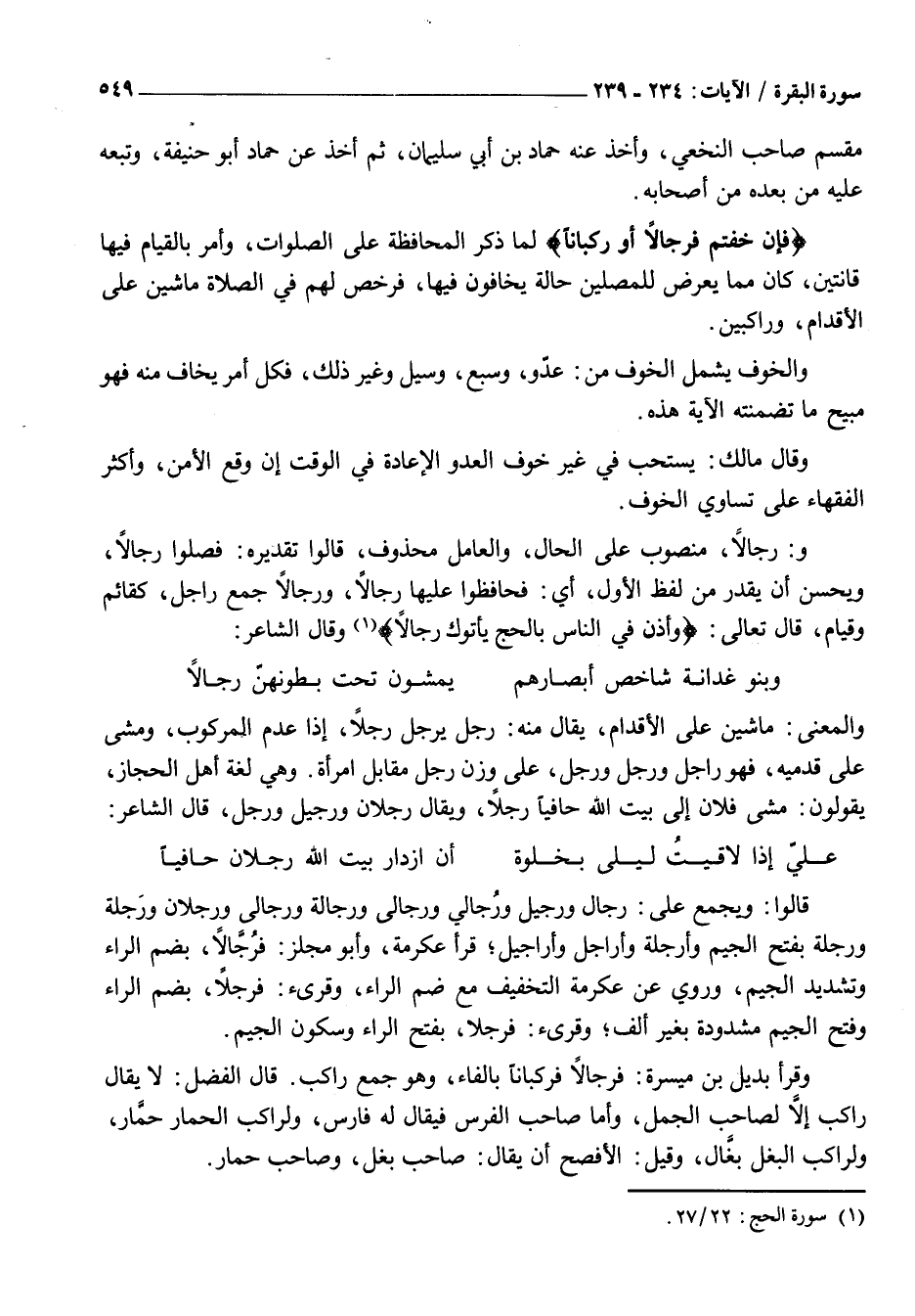وَالْمَعْنَى: مَاشِينَ عَلَى الْأَقْدَامِ، يُقَالُ مِنْهُ: رَجِلَ يَرْجُلُ رَجْلًا، إِذَا عَدِمَ الْمَرْكُوبَ، وَمَشَى عَلَى قَدَمَيْهِ، فَهُوَ رَاجِلٌ وَرَجِلٌ وَرَجُلٌ، عَلَى وَزْنِ رَجُلٍ مُقَابِلِ امْرَأَةٍ. وَهِيَ لُغَةُ أَهْلِ الْحِجَازِ، يَقُولُونَ: مَشَى فُلَانٌ إِلَى بَيْتِ اللَّهِ حَافِيًا رَجُلًا، وَيُقَالُ رَجْلَانُ وَرَجِيلٌ وَرَجْلٌ، قَالَ الشاعر: