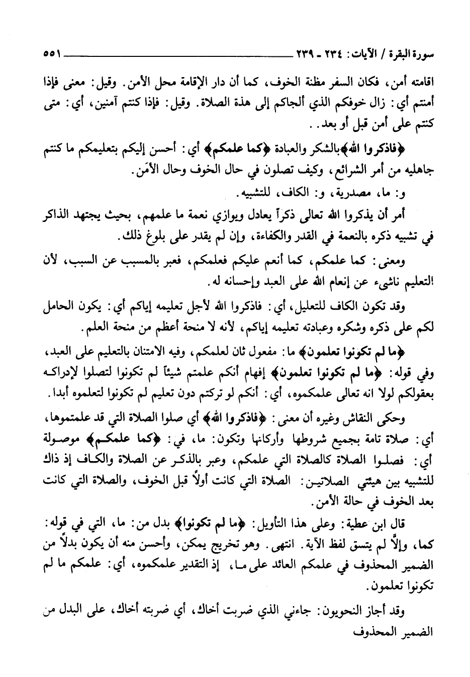 وَحَكَى النَّقَّاشُ وَغَيْرُهُ أَنَّ مَعْنَى: فَاذْكُرُوا اللَّهَ أَيْ صَلُّوا الصَّلَاةَ الَّتِي قَدْ عُلِّمْتُمُوهَا، أَيْ: صَلَاةً تَامَّةً بِجَمِيعِ شُرُوطِهَا وَأَرْكَانِهَا وَتَكُونُ: مَا، فِي: كَما عَلَّمَكُمْ مَوْصُولَةً أَيْ: فَصَلُّوا الصَّلَاةَ كَالصَّلَاةِ الَّتِي عَلَّمَكُمْ، وَعَبَّرَ بِالذِّكْرِ عَنِ الصَّلَاةِ وَالْكَافُ إِذْ ذَاكَ لِلتَّشْبِيهِ بَيْنَ هَيْئَتَيِ الصَّلَاتَيْنِ: الصَّلَاةِ الَّتِي كَانَتْ أَوَّلًا قَبْلَ الْخَوْفِ، وَالصَّلَاةِ الَّتِي كَانَتْ بَعْدَ الْخَوْفِ فِي حَالَةِ الْأَمْنِ.