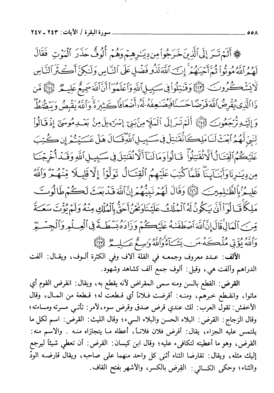 أَلَمْ تَرَ إِلَى الَّذِينَ خَرَجُوا مِنْ دِيارِهِمْ وَهُمْ أُلُوفٌ حَذَرَ الْمَوْتِ فَقالَ لَهُمُ اللَّهُ مُوتُوا ثُمَّ أَحْياهُمْ إِنَّ اللَّهَ لَذُو فَضْلٍ عَلَى النَّاسِ وَلكِنَّ أَكْثَرَ النَّاسِ لَا يَشْكُرُونَ (243) وَقاتِلُوا فِي سَبِيلِ اللَّهِ وَاعْلَمُوا أَنَّ اللَّهَ سَمِيعٌ عَلِيمٌ (244) مَنْ ذَا الَّذِي يُقْرِضُ اللَّهَ قَرْضاً حَسَناً فَيُضاعِفَهُ لَهُ أَضْعافاً كَثِيرَةً وَاللَّهُ يَقْبِضُ وَيَبْصُطُ وَإِلَيْهِ تُرْجَعُونَ (245) أَلَمْ تَرَ إِلَى الْمَلَإِ مِنْ بَنِي إِسْرائِيلَ مِنْ بَعْدِ مُوسى إِذْ قالُوا لِنَبِيٍّ لَهُمُ ابْعَثْ لَنا مَلِكاً نُقاتِلْ فِي سَبِيلِ اللَّهِ قالَ هَلْ عَسَيْتُمْ إِنْ كُتِبَ عَلَيْكُمُ الْقِتالُ أَلاَّ تُقاتِلُوا قالُوا وَما لَنا أَلاَّ نُقاتِلَ فِي سَبِيلِ اللَّهِ وَقَدْ أُخْرِجْنا مِنْ دِيارِنا وَأَبْنائِنا فَلَمَّا كُتِبَ عَلَيْهِمُ الْقِتالُ تَوَلَّوْا إِلاَّ قَلِيلاً مِنْهُمْ وَاللَّهُ عَلِيمٌ بِالظَّالِمِينَ (246) وَقالَ لَهُمْ نَبِيُّهُمْ إِنَّ اللَّهَ قَدْ بَعَثَ لَكُمْ طالُوتَ مَلِكاً قالُوا أَنَّى يَكُونُ لَهُ الْمُلْكُ عَلَيْنا وَنَحْنُ أَحَقُّ بِالْمُلْكِ مِنْهُ وَلَمْ يُؤْتَ سَعَةً مِنَ الْمالِ قالَ إِنَّ اللَّهَ اصْطَفاهُ عَلَيْكُمْ وَزادَهُ بَسْطَةً فِي الْعِلْمِ وَالْجِسْمِ وَاللَّهُ يُؤْتِي مُلْكَهُ مَنْ يَشاءُ وَاللَّهُ واسِعٌ عَلِيمٌ (247)