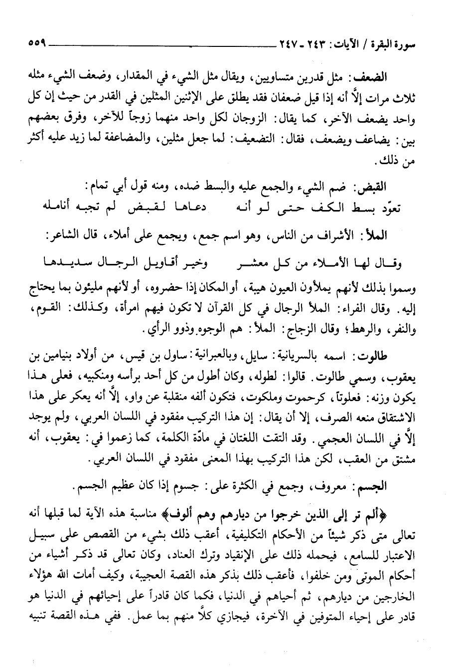 أَلَمْ تَرَ إِلَى الَّذِينَ خَرَجُوا مِنْ دِيارِهِمْ وَهُمْ أُلُوفٌ مُنَاسَبَةُ هَذِهِ الْآيَةِ لِمَا قَبْلَهَا أَنَّهُ تَعَالَى مَتَى ذَكَرَ شَيْئًا مِنَ الْأَحْكَامِ التَّكْلِيفِيَّةِ، أَعْقَبَ ذَلِكَ بِشَيْءٍ مِنَ الْقَصَصِ عَلَى سَبِيلِ الِاعْتِبَارِ لِلسَّامِعِ، فَيَحْمِلُهُ ذَلِكَ عَلَى الِانْقِيَادِ وَتَرْكِ الْعِنَادِ، وَكَانَ تَعَالَى قَدْ ذَكَرَ أَشْيَاءَ مِنْ أَحْكَامِ الْمَوْتَى وَمَنْ خَلَفُوا، فَأَعْقَبَ ذَلِكَ بِذِكْرِ هَذِهِ الْقِصَّةِ الْعَجِيبَةِ، وَكَيْفَ أَمَاتَ اللَّهُ هَؤُلَاءِ الْخَارِجِينَ مِنْ دِيَارِهِمْ، ثُمَّ أَحْيَاهُمْ فِي الدُّنْيَا، فَكَمَا كَانَ قَادِرًا عَلَى إِحْيَائِهِمْ فِي الدُّنْيَا هُوَ قَادِرٌ عَلَى إِحْيَاءِ الْمُتَوَفَّيْنَ فِي الْآخِرَةِ، فَيُجَازِي كُلًّا مِنْهُمْ بِمَا عَمِلَ. فَفِي هَذِهِ الْقِصَّةِ تَنْبِيهٌ