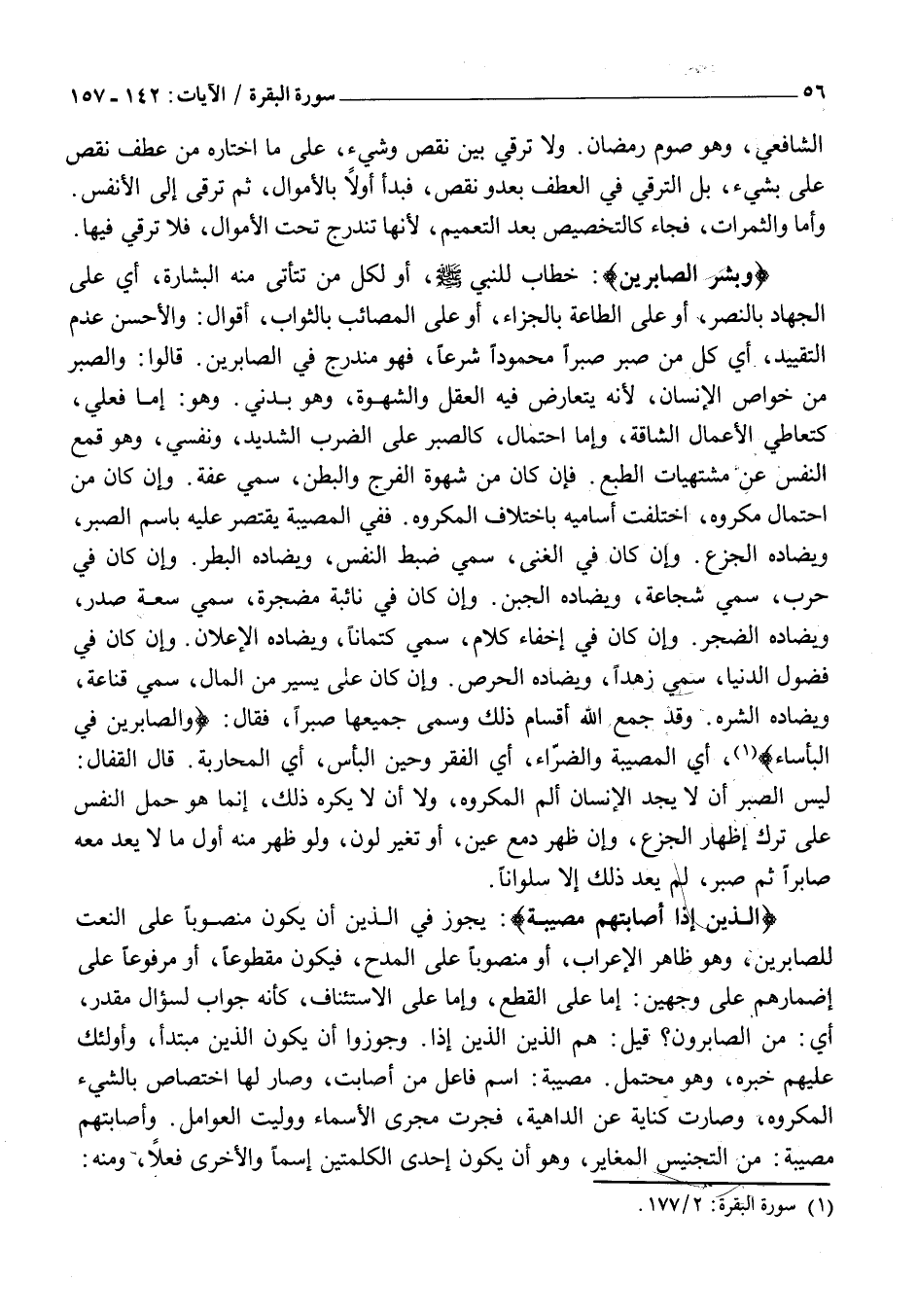 الَّذِينَ إِذا أَصابَتْهُمْ مُصِيبَةٌ: يَجُوزُ فِي الَّذِينَ أَنْ يَكُونَ مَنْصُوبًا عَلَى النَّعْتِ لِلصَّابِرِينَ، وَهُوَ ظَاهِرُ الْإِعْرَابِ، أَوْ مَنْصُوبًا عَلَى الْمَدْحِ، فَيَكُونُ مَقْطُوعًا، أو مرفوعا على إضمارهم عَلَى وَجْهَيْنِ: إِمَّا عَلَى الْقَطْعِ، وَإِمَّا عَلَى الِاسْتِئْنَافِ، كَأَنَّهُ جَوَابٌ لِسُؤَالٍ مُقَدَّرٍ، أَيْ: مَنِ الصَّابِرُونَ؟ قِيلَ: هم الذين الَّذِينَ إِذَا. وَجَوَّزُوا أَنْ يَكُونَ الَّذِينَ مُبْتَدَأً، وَأُولَئِكَ عَلَيْهِمْ خَبَرُهُ، وَهُوَ مُحْتَمَلٌ. مُصِيبَةٌ: اسْمُ فَاعِلٍ مِنْ أَصَابَتْ، وَصَارَ لَهَا اخْتِصَاصٌ بِالشَّيْءِ الْمَكْرُوهِ، وَصَارَتْ كِنَايَةً عَنِ الدَّاهِيَةِ، فَجَرَتْ مَجْرَى الْأَسْمَاءِ وَوَلِيَتِ الْعَوَامِلَ. وَأَصَابَتْهُمْ مُصِيبَةٌ: مِنَ التَّجْنِيسِ الْمُغَايِرِ، وَهُوَ أَنْ يَكُونَ إِحْدَى الْكَلِمَتَيْنِ اسْمًا وَالْأُخْرَى فِعْلًا، ومنه: