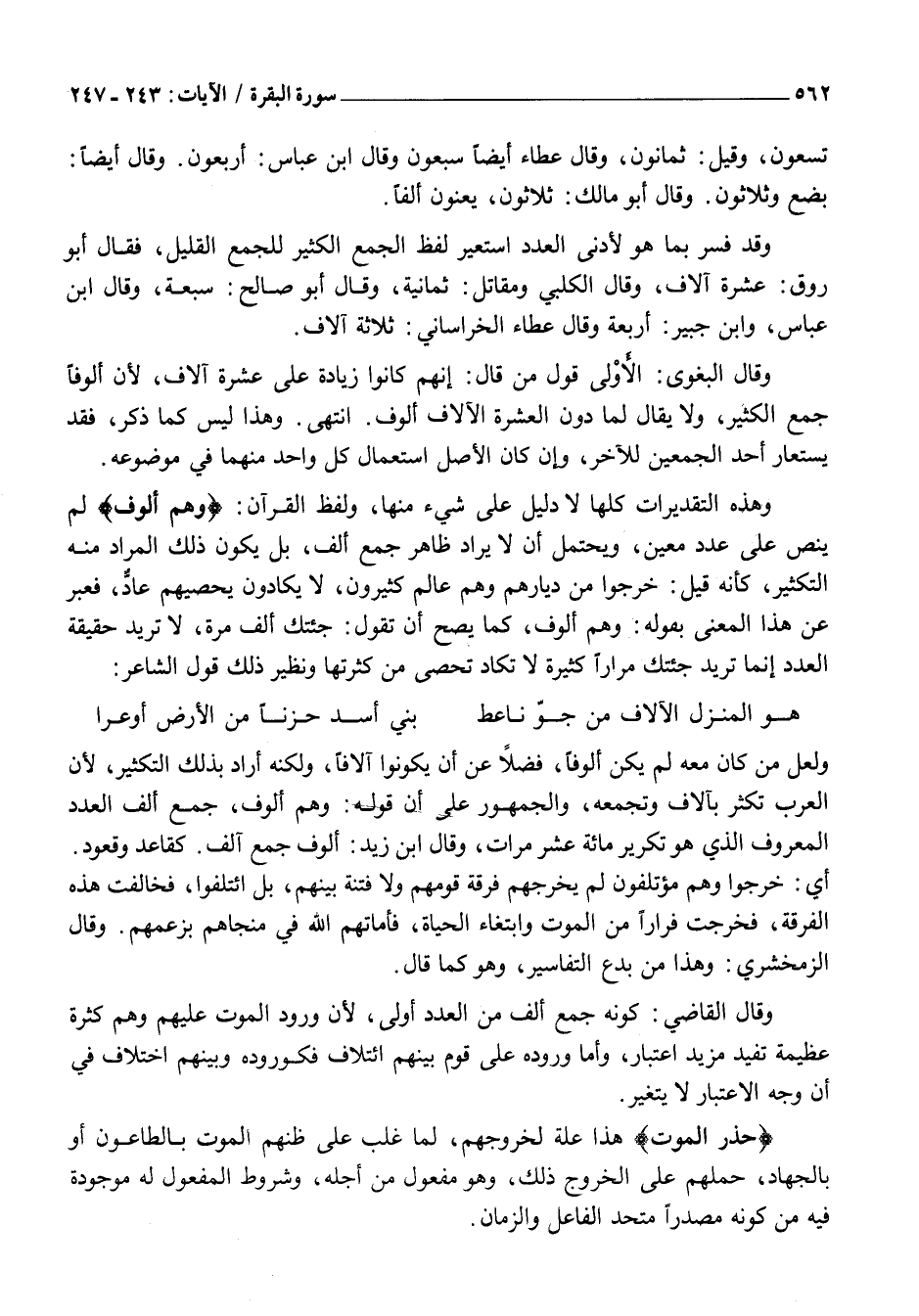 وَهَذِهِ التَّقْدِيرَاتُ كُلُّهَا لَا دَلِيلَ عَلَى شَيْءٍ مِنْهَا، وَلَفْظُ الْقُرْآنِ: وَهُمْ أُلُوفٌ لَمْ يَنُصَّ عَلَى عَدَدٍ مُعَيَّنٍ، وَيُحْتَمَلُ أَنْ لَا يُرَادَ ظَاهِرُ جَمْعِ أَلْفٍ، بَلْ يَكُونُ ذَلِكَ الْمُرَادُ مِنْهُ التَّكْثِيرُ، كَأَنَّهُ قِيلَ: خَرَجُوا مِنْ دِيَارِهِمْ وَهُمْ عَالَمٌ كَثِيرُونَ، لَا يَكَادُونَ يُحْصِيهِمْ عَادٌّ، فَعَبَّرَ عَنْ هَذَا الْمَعْنَى بِقَوْلِهِ: وَهُمْ أُلُوفٌ، كَمَا يَصِحُّ أَنْ تَقُولَ: جِئْتُكَ أَلْفَ مَرَّةٍ، لَا تُرِيدُ حَقِيقَةَ الْعَدَدِ إِنَّمَا تُرِيدُ جِئْتُكَ مِرَارًا كَثِيرَةً لَا تَكَادُ تُحْصَى مِنْ كَثْرَتِهَا وَنَظِيرُ ذَلِكَ قَوْلُ الشَّاعِرِ: