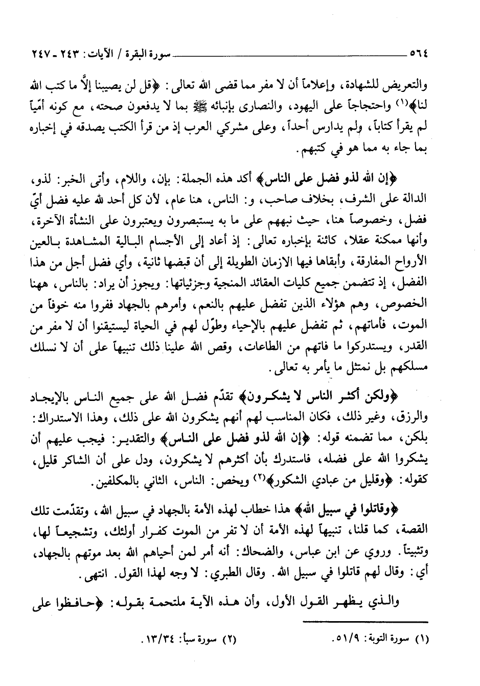 إِنَّ اللَّهَ لَذُو فَضْلٍ عَلَى النَّاسِ أَكَّدَ هذه الجملة: بإن، وَاللَّامِ، وَأَتَى الْخَبَرُ: لَذُو، الدَّالَّةُ عَلَى الشَّرَفِ، بِخِلَافِ صَاحِبٍ، وَ: النَّاسِ، هُنَا عَامٌّ، لِأَنَّ كُلَّ أَحَدٍ لِلَّهِ عَلَيْهِ فَضْلٌ أَيُّ فَضْلٍ، وَخُصُوصًا هُنَا، حَيْثُ نَبَّهَهُمْ عَلَى مَا بِهِ يَسْتَبْصِرُونَ وَيَعْتَبِرُونَ عَلَى النَّشْأَةِ الْآخِرَةِ، وَأَنَّهَا مُمْكِنَةٌ عَقْلًا، كَائِنَةٌ بِإِخْبَارِهِ تَعَالَى: إِذْ أَعَادَ إِلَى الْأَجْسَامِ الْبَالِيَةِ الْمُشَاهَدَةِ بِالْعَيْنِ الْأَرْوَاحَ الْمُفَارِقَةَ، وَأَبْقَاهَا فِيهَا الْأَزْمَانَ الطَّوِيلَةَ إِلَى أَنْ قَبَضَهَا ثَانِيَةً، وَأَيُّ فَضْلٍ أَجَلُّ مِنْ هَذَا الْفَضْلِ، إِذْ تَتَضَمَّنُ جَمِيعَ كُلِّيَّاتِ الْعَقَائِدِ الْمُنْجِيَةِ وَجُزْئِيَّاتِهَا: وَيَجُوزُ أَنْ يُرَادَ: بالناس، هاهنا الْخُصُوصُ، وَهُمْ هَؤُلَاءِ الَّذِينَ تَفَضَّلَ عَلَيْهِمْ بِالنِّعَمِ، وَأَمَرَهُمْ بِالْجِهَادِ فَفَرُّوا مِنْهُ خَوْفًا مِنَ الْمَوْتِ، فَأَمَاتَهُمْ، ثُمَّ تَفَضَّلَ عَلَيْهِمْ بِالْإِحْيَاءِ وَطَوَّلَ لَهُمْ فِي الْحَيَاةِ لِيَسْتَيْقِنُوا أن لا مفر من الْقَدَرِ، وَيَسْتَدْرِكُوا مَا فَاتَهُمْ مِنَ الطَّاعَاتِ، وَقَصَّ اللَّهُ عَلَيْنَا ذَلِكَ تَنْبِيهًا عَلَى أَنْ لَا نَسْلُكَ مَسْلَكَهُمْ بَلْ نَمْتَثِلُ مَا يَأْمُرُ بِهِ تَعَالَى.