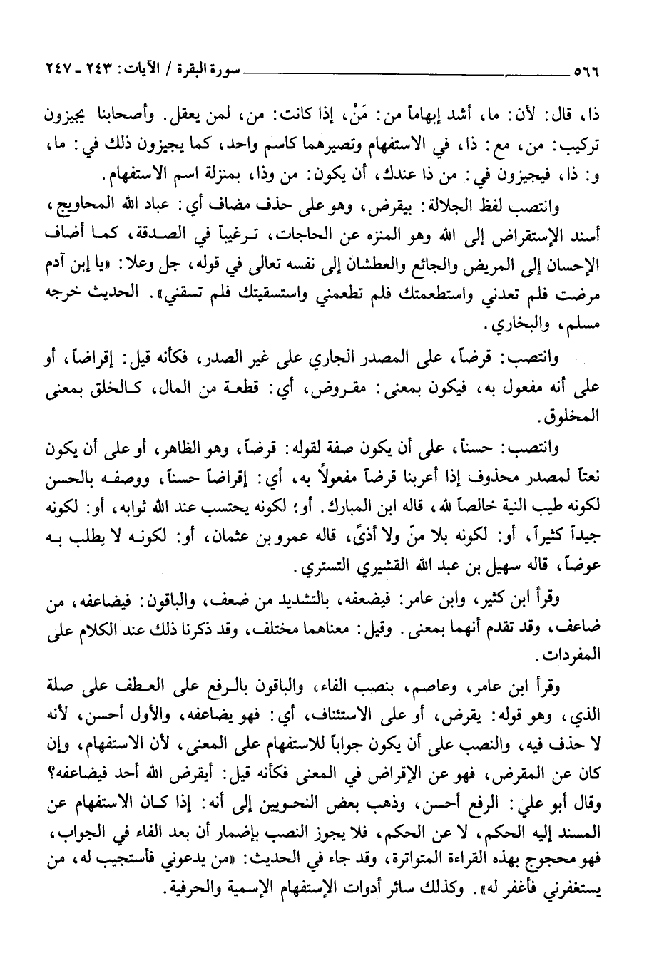 وَانْتَصَبَ لفظ الجلالة: بيقرض، وَهُوَ عَلَى حَذْفِ مُضَافٍ أَيْ: عِبَادَ اللَّهِ الْمَحَاوِيجَ، أَسْنَدَ الِاسْتِقْرَاضَ إِلَى اللَّهِ وَهُوَ الْمُنَزَّهُ عَنِ الْحَاجَاتِ، تَرْغِيبًا فِي الصَّدَقَةِ، كَمَا أَضَافَ الْإِحْسَانَ إِلَى الْمَرِيضِ وَالْجَائِعِ وَالْعَطْشَانِ إِلَى نَفْسِهِ تَعَالَى
