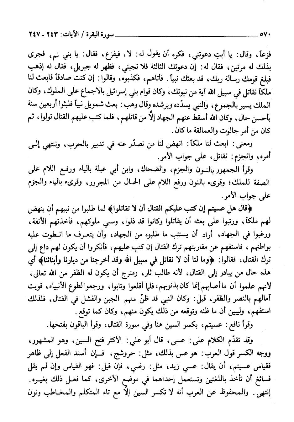 وَمَعْنَى: ابْعَثْ لَنَا مَلِكًا: أَنْهِضْ لَنَا مَنْ نَصْدُرُ عنه في تدبير بالحرب، وَنَنْتَهِي إِلَى أَمْرِهِ، وَانْجَزَمَ: نُقَاتِلْ، عَلَى جَوَابِ الْأَمْرِ.