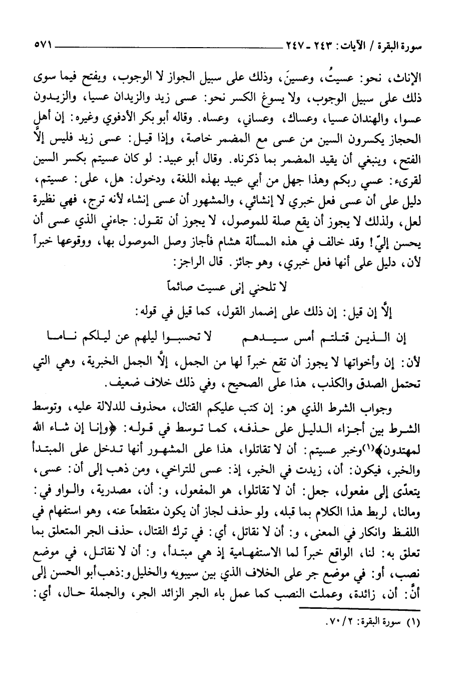 وَجَوَابُ الشَّرْطِ الَّذِي هُوَ: إِنْ كُتِبَ عَلَيْكُمُ الْقِتَالُ، مَحْذُوفٌ لِلدَّلَالَةِ عَلَيْهِ، وَتَوَسَّطَ الشَّرْطُ بَيْنَ أَجْزَاءِ الدَّلِيلِ عَلَى حَذْفِهِ، كَمَا تَوَسَّطَ فِي قَوْلِهِ: وَإِنَّا إِنْ شاءَ اللَّهُ لَمُهْتَدُونَ «1» وَخَبَرُ عَسَيْتُمْ: أَنْ لَا تُقَاتِلُوا، هَذَا عَلَى الْمَشْهُورِ أَنَّهَا تَدْخُلُ عَلَى الْمُبْتَدَأِ وَالْخَبَرِ، فَيَكُونُ: أَنْ، زِيدَتْ فِي الْخَبَرِ، إِذْ: عَسَى لِلتَّرَاخِي، وَمَنْ ذَهَبَ إِلَى أَنَّ: عَسَى، يَتَعَدَّى إِلَى مَفْعُولٍ، جَعَلَ: أَنْ لَا تُقَاتِلُوا، هُوَ الْمَفْعُولَ، وَ: أَنْ، مَصْدَرِيَّةٌ، وَالْوَاوُ فِي: