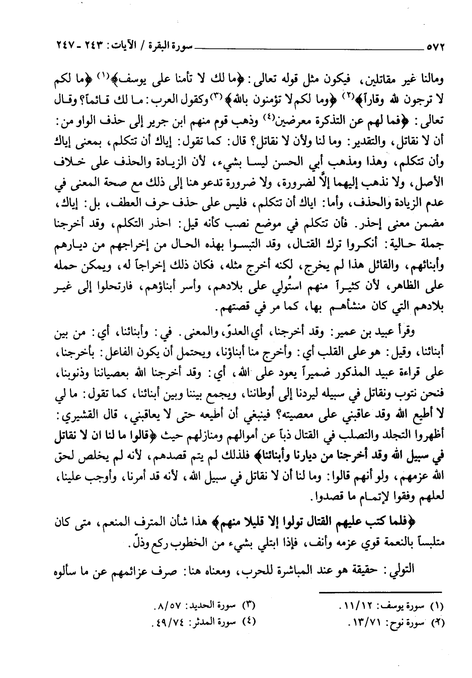 أَنْ لَا نُقَاتِلَ، وَالتَّقْدِيرُ: وَمَا لَنَا وَلِأَنْ لَا نُقَاتِلَ؟ قَالَ: كَمَا تَقُولُ: إِيَّاكَ أَنْ تَتَكَلَّمَ، بِمَعْنَى إِيَّاكَ وَأَنْ تَتَكَلَّمَ، وَهَذَا وَمَذْهَبُ أَبِي الْحَسَنِ لَيْسَا بِشَيْءٍ، لِأَنَّ الزِّيَادَةَ وَالْحَذْفَ عَلَى خِلَافِ الْأَصْلِ، وَلَا نَذْهَبُ إِلَيْهِمَا إِلَّا لِضَرُورَةٍ، وَلَا ضَرُورَةَ تَدْعُو هُنَا إِلَى ذَلِكَ مَعَ صِحَّةِ الْمَعْنَى فِي عَدَمِ الزِّيَادَةِ وَالْحَذْفِ، وَأَمَّا: إِيَّاكَ أَنْ تَتَكَلَّمَ، فَلَيْسَ عَلَى حَذْفِ حَرْفِ الْعَطْفِ، بَلْ: إِيَّاكَ، مُضَمَّنٌ مَعْنَى احْذَرْ. فَأَنْ تَتَكَلَّمَ فِي مَوْضِعِ نَصْبٍ كَأَنَّهُ قِيلَ: احْذَرِ التَّكَلُّمَ، وَقَدْ أُخْرِجْنَا جُمْلَةٌ حَالِيَّةٌ: أَنْكَرُوا تَرْكَ الْقِتَالِ، وَقَدِ الْتَبَسُوا بِهَذِهِ الْحَالِ مِنْ إِخْرَاجِهِمْ مِنْ دِيَارِهِمْ وَأَبْنَائِهِمْ، وَالْقَائِلُ هَذَا لَمْ يَخْرُجْ، لَكِنَّهُ أُخْرِجَ مِثْلُهُ، فَكَانَ ذَلِكَ إِخْرَاجًا لَهُ، وَيُمْكِنُ حَمْلُهُ عَلَى الظَّاهِرِ، لِأَنَّ كَثِيرًا مِنْهُمُ اسْتُولِيَ عَلَى بِلَادِهِمْ، وَأُسِرَ أَبْنَاؤُهُمْ، فَارْتَحَلُوا إِلَى غَيْرِ بلادهم التي كان منشأهم بِهَا، كَمَا مَرَّ فِي قِصَّتِهِمْ.