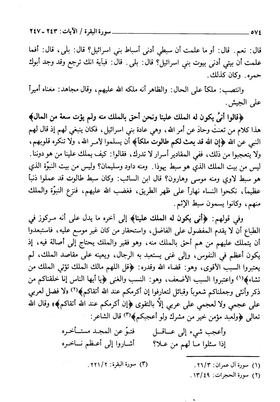 قالُوا أَنَّى يَكُونُ لَهُ الْمُلْكُ عَلَيْنا وَنَحْنُ أَحَقُّ بِالْمُلْكِ مِنْهُ وَلَمْ يُؤْتَ سَعَةً مِنَ الْمالِ هَذَا كَلَامُ مَنْ تَعَنَّتَ وَحَادَ عَنْ أَمْرِ اللَّهِ، وَهِيَ عَادَةُ بَنِي إِسْرَائِيلَ، فَكَانَ يَنْبَغِي لَهُمْ إِذْ قَالَ لَهُمُ النَّبِيُّ عَنِ اللَّهِ إِنَّ اللَّهَ قَدْ بَعَثَ لَكُمْ طالُوتَ مَلِكاً أن يسلموا لأمر الله، وَلَا تُنْكِرُهُ قُلُوبُهُمْ، وَلَا يَتَعَجَّبُوا مِنْ ذَلِكَ، فَفِي الْمَقَادِيرِ أَسْرَارٌ لَا تُدْرَكُ، فَقَالُوا: كَيْفَ يُمَلَّكُ عَلَيْنَا من هو دوننا.
