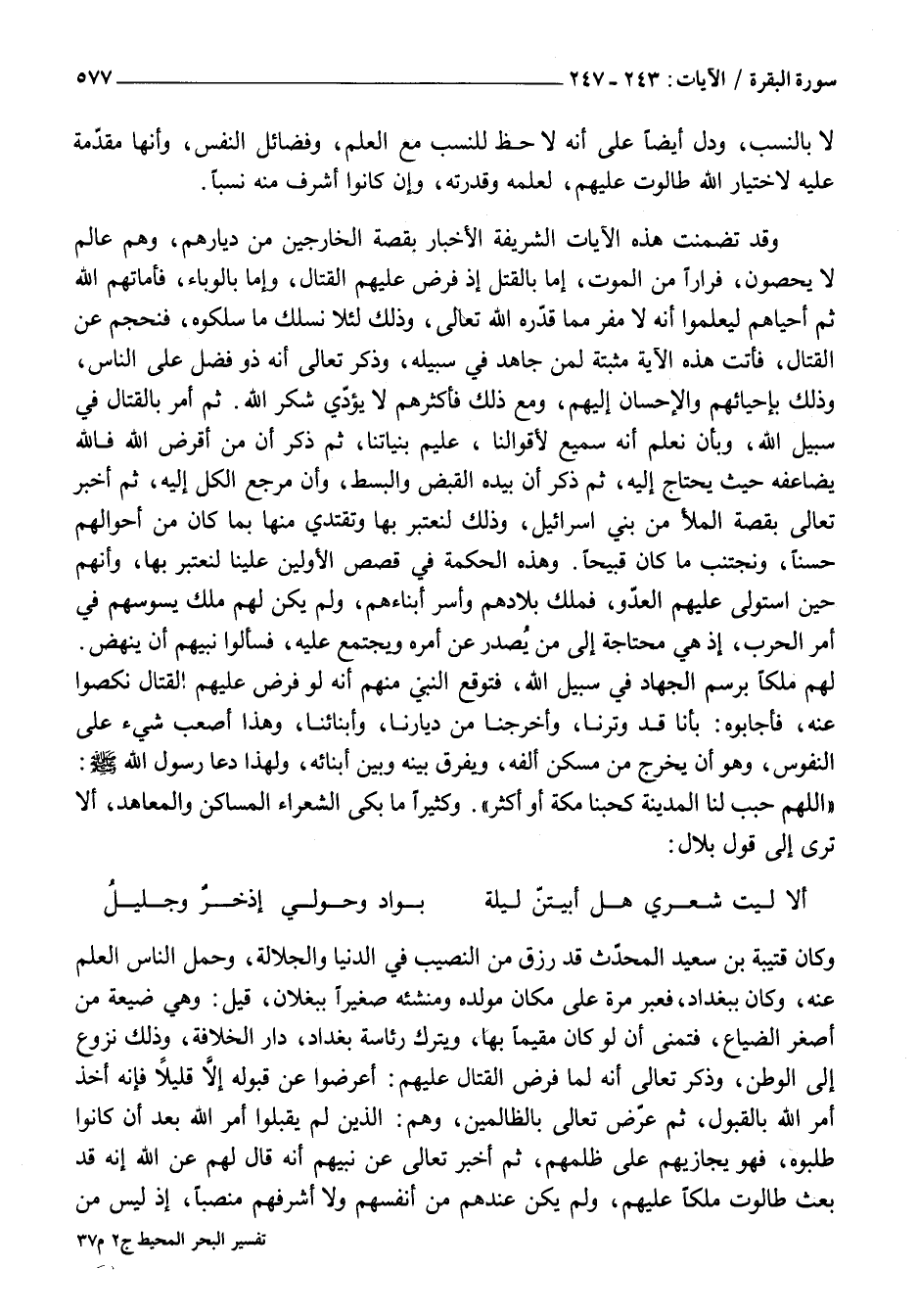 وَكَانَ قُتَيْبَةُ بْنُ سَعِيدٍ الْمُحَدِّثُ قَدْ رُزِقَ مِنَ النَّصِيبِ فِي الدُّنْيَا وَالْجَلَالَةِ، وَحَمَلَ النَّاسُ الْعِلْمَ عَنْهُ، وَكَانَ بِبَغْدَادَ، فَعَبَرَ مَرَّةً عَلَى مَكَانِ مَوْلِدِهِ وَمَنْشَئِهِ صَغِيرًا بِبَغْلَانَ، قِيلَ: وَهِيَ ضَيْعَةٌ مِنْ أَصْغَرِ الضَّيَاعِ، فَتَمَنَّى أَنْ لَوْ كَانَ مُقِيمًا بِهَا، وَيَتْرُكَ رِئَاسَةَ بَغْدَادَ، دَارِ الْخِلَافَةِ، وَذَلِكَ نُزُوعٌ إِلَى الْوَطَنِ، وَذَكَرَ تَعَالَى أَنَّهُ لَمَّا فُرِضَ الْقِتَالُ عَلَيْهِمْ: أَعْرَضُوا عَنْ قَبُولِهِ إِلَّا قَلِيلًا فَإِنَّهُ أَخَذَ أَمْرَ اللَّهِ بِالْقَبُولِ، ثُمَّ عَرَّضَ تَعَالَى بِالظَّالِمِينَ، وَهُمُ: الَّذِينَ لَمْ يَقْبَلُوا أَمْرَ اللَّهِ بَعْدَ أَنْ كَانُوا طَلَبُوهُ، فَهُوَ يُجَازِيهِمْ عَلَى ظُلْمِهِمْ، ثُمَّ أَخْبَرَ تَعَالَى عَنْ نَبِيِّهِمْ أَنَّهُ قَالَ لَهُمْ عَنِ اللَّهِ إِنَّهُ قَدْ بَعَثَ طَالُوتَ مَلِكًا عَلَيْهِمْ، وَلَمْ يَكُنْ عِنْدَهُمْ مِنْ أَنْفَسِهِمْ وَلَا أَشْرَفِهِمْ مَنْصِبًا، إِذْ لَيْسَ مِنْ